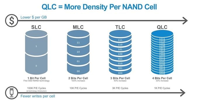 Pojemniej i taniej, ale kosztem trwałości – tak w skrócie można opisać rozwój układów pamięci Flash pod kątem liczby bitów, które mogą zapisywać ich komórki. Przez to pamięci SLC (jeden bit na komórkę) stały się już ekskluzywnym buforem dla wielu dysków, MLC (dwa bity) są spotykane rzadko w modelach o podwyższonej trwałości, TLC stanowi najlepszy stosunek ceny do trwałości i pojemności, a QLC (cztery bity) mają za zadanie zapewniać rekordowe pojemności. Trwają już zresztą prace nad 5-bitowymi układami Flash, ale nie widać ich nawet na horyzoncie, przez co dzieło firmy Floadia Corporation tak zaskakuje, choć do SSD może nigdy nie trafić.
