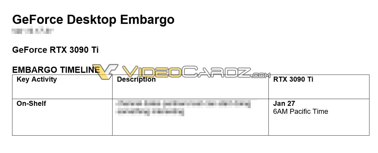Na temat tego modelu pisaliśmy już wiele razy, a dziś wreszcie można potwierdzić jego istnienie przez wyciek dokumentu dla firm współpracujących z NVIDIA, który wskazuje na premierę rynkową 27 stycznia. Mowa więc o tym samym dniu, w którym na rynek ma wpaść RTX 3050, co sugeruje ten sam dzień zapowiedzi – 4 stycznia. Dla przypomnienia, ta karta sięgnie po w pełni odblokowany rdzeń GA102-350, co w porównaniu z GA102-300 z RTX 3090 zwiększy liczbę rdzeni CUDA, RT i Tensor oraz jednostek ROP z kolejno 10496, 82, 328 i 112 do 10752, 84, 336 i 128.