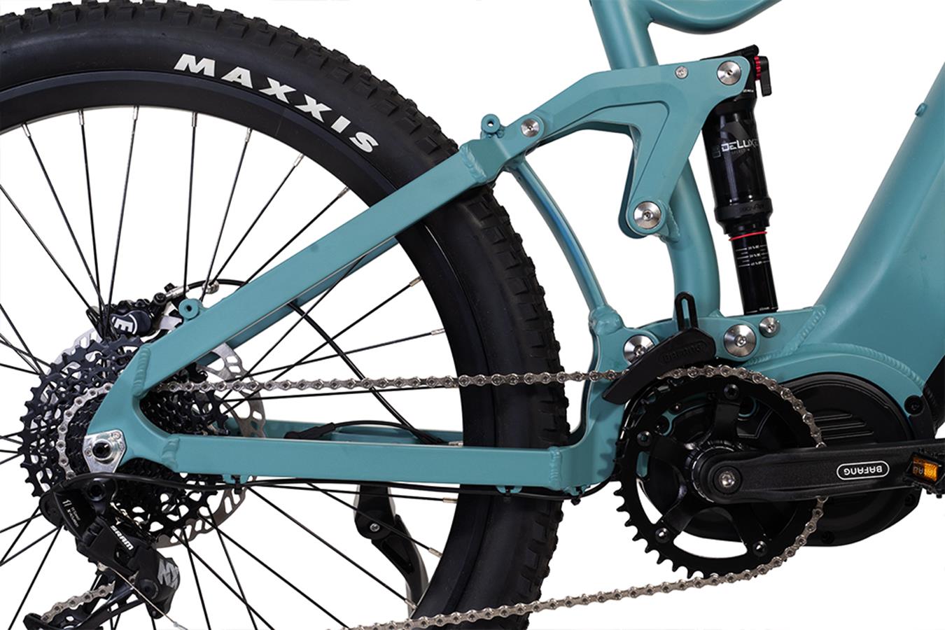 Cała wspaniałość tego eMTB została zbudowana wokół układu napędowego. Nie bez powodu, bo ten obejmuje silnik elektryczny Bafan Ultra między korbami o mocy nominalnej rzędu 1000 watów i 1500 W szczytowej. Między stopami rowerzysty znajduje się więc potężna jednostka napędowa, która równie dobrze przyspiesza (firma nie ujawniła dokładnych pomiarów), co wysysa energię z pokładowego akumulatora.
