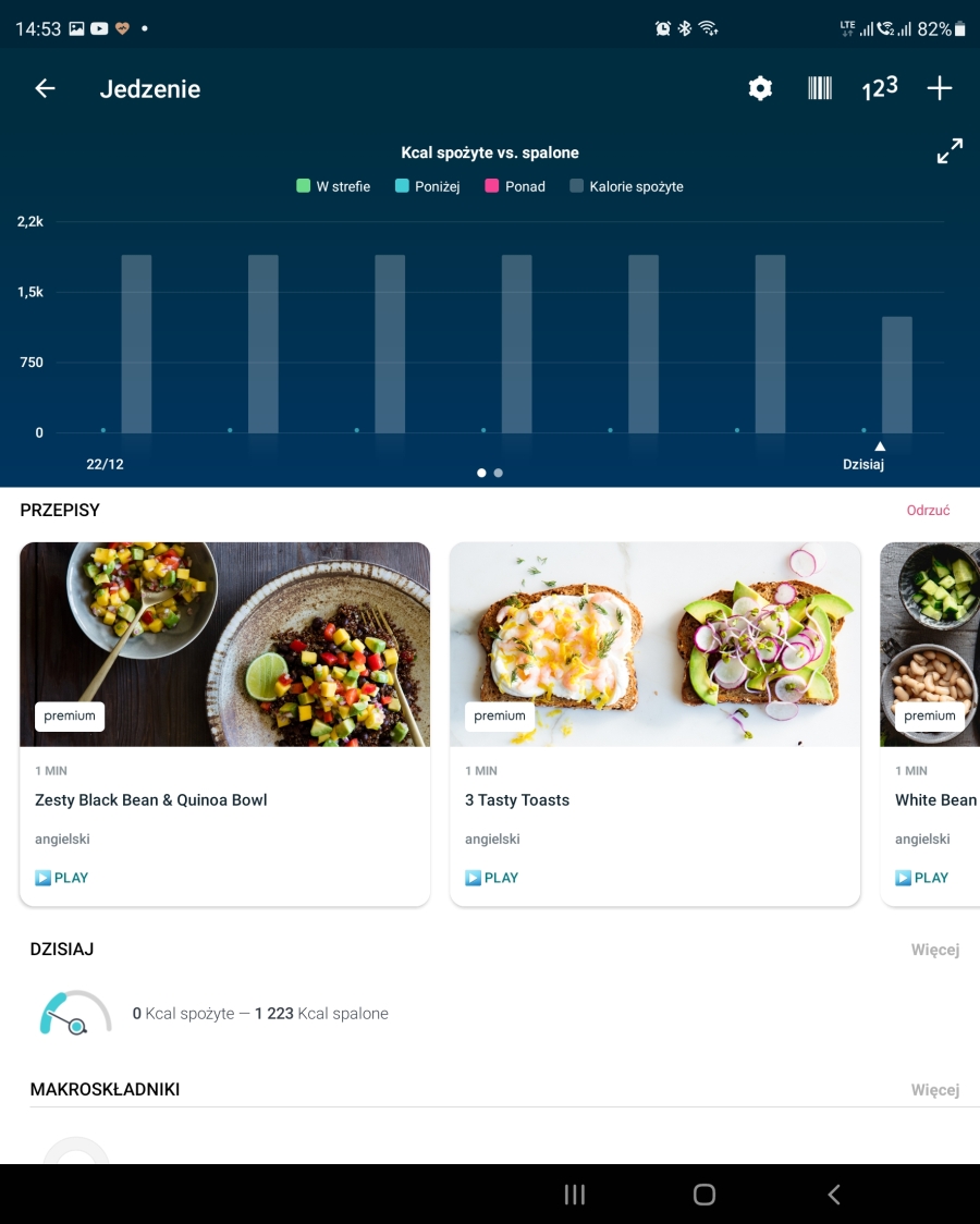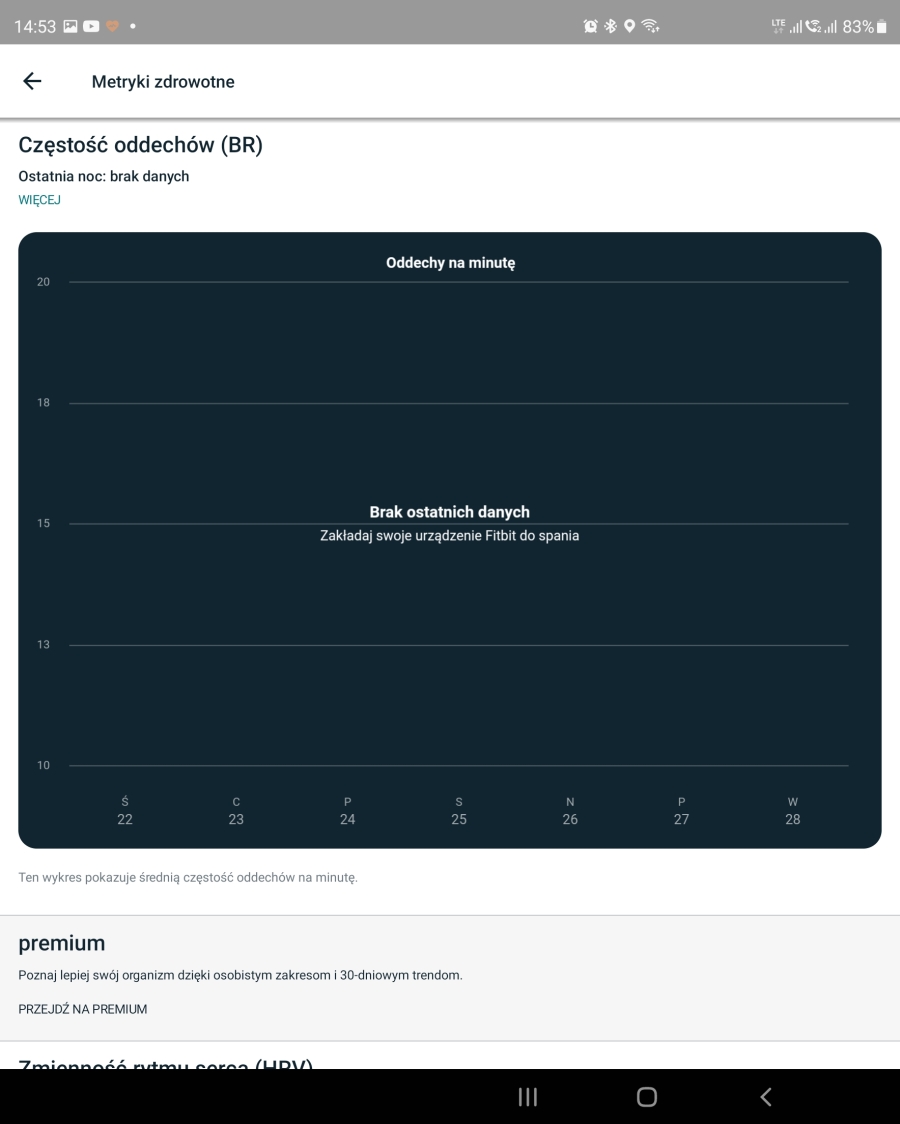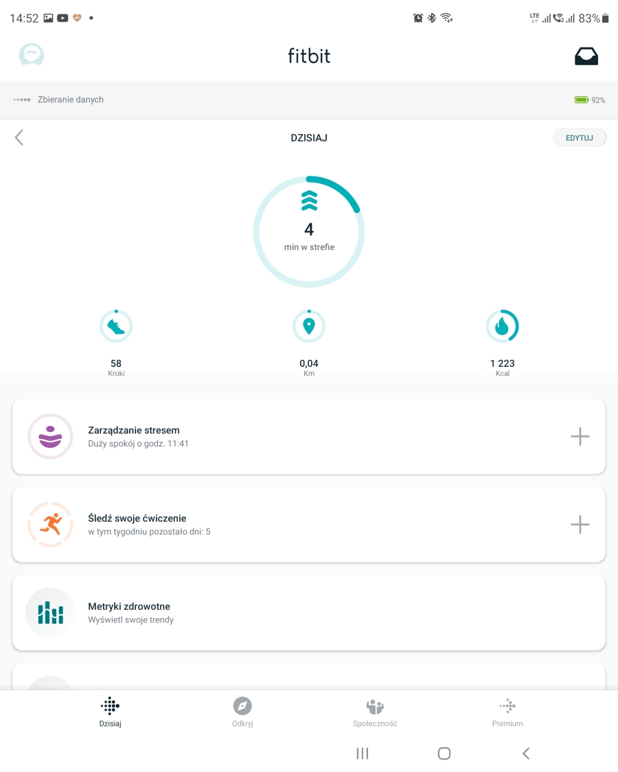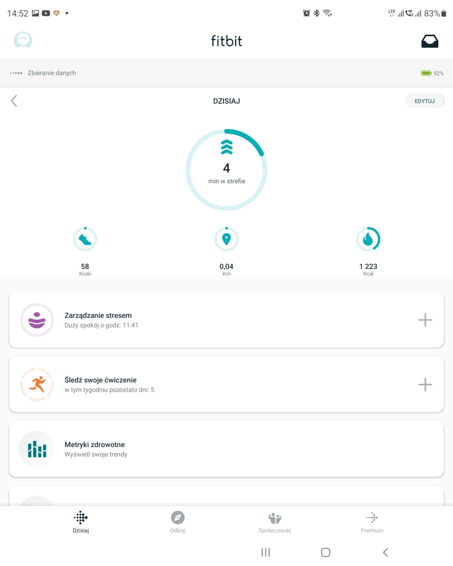 Aplikacja jest swoistym hubem tego, co robimy w trakcie całej doby. Znajdziemy w niej dokładne wykresy rytmu serca, temperatury ciała, częstość oddechów w trakcie snu, zmiany rytmu serca, wykres tętna spoczynkowego, czy saturacji. Nie zabrakło śledzenia cykli miesiączkowych. Do tego możemy zapisywać w aplikacji posiłki, ilość wypitej wody oraz aktualny stan swojego samopoczucia. Następnie aplikacja konfrontuje naszą ocenę ze stanem pracy organizmu i pokazuje nam, czy dobrze radzimy sobie ze stresem. Możemy też zapisywać swoją wagę, albo synchronizować wyniki z wagą Fitbit i dodawać do tego aktualny poziom tkanki tłuszczowej. Duża część opcji jest dostępna za darmo, część po wykupieniu abonamentu Fitbit Premium (pierwsze pół roku za darmo). Dostępnych opcji jest tyle, że na upartego zachodząc do lekarza, na pytanie jak się czujemy, moglibyśmy pokazać aplikację ze wszystkimi danymi.