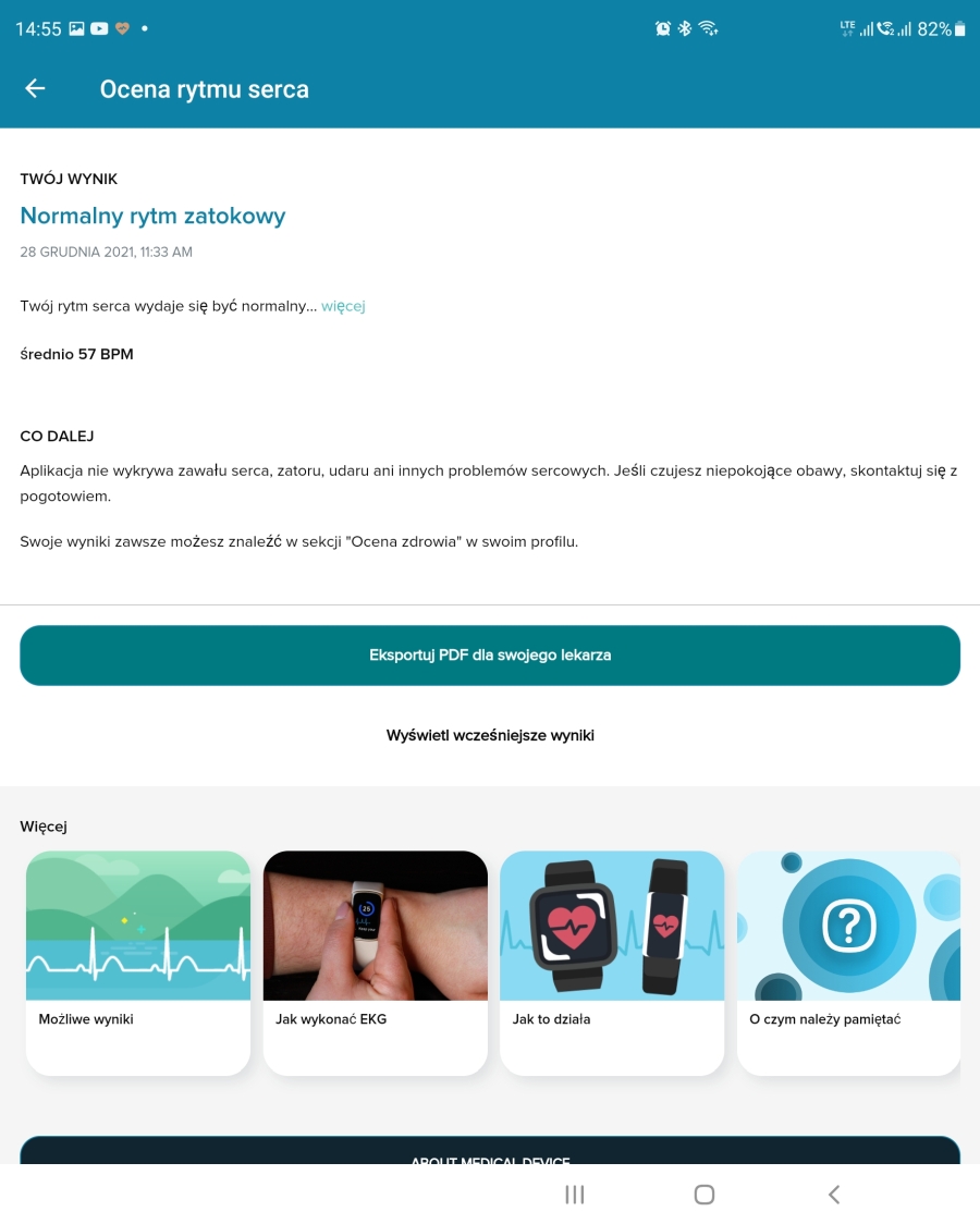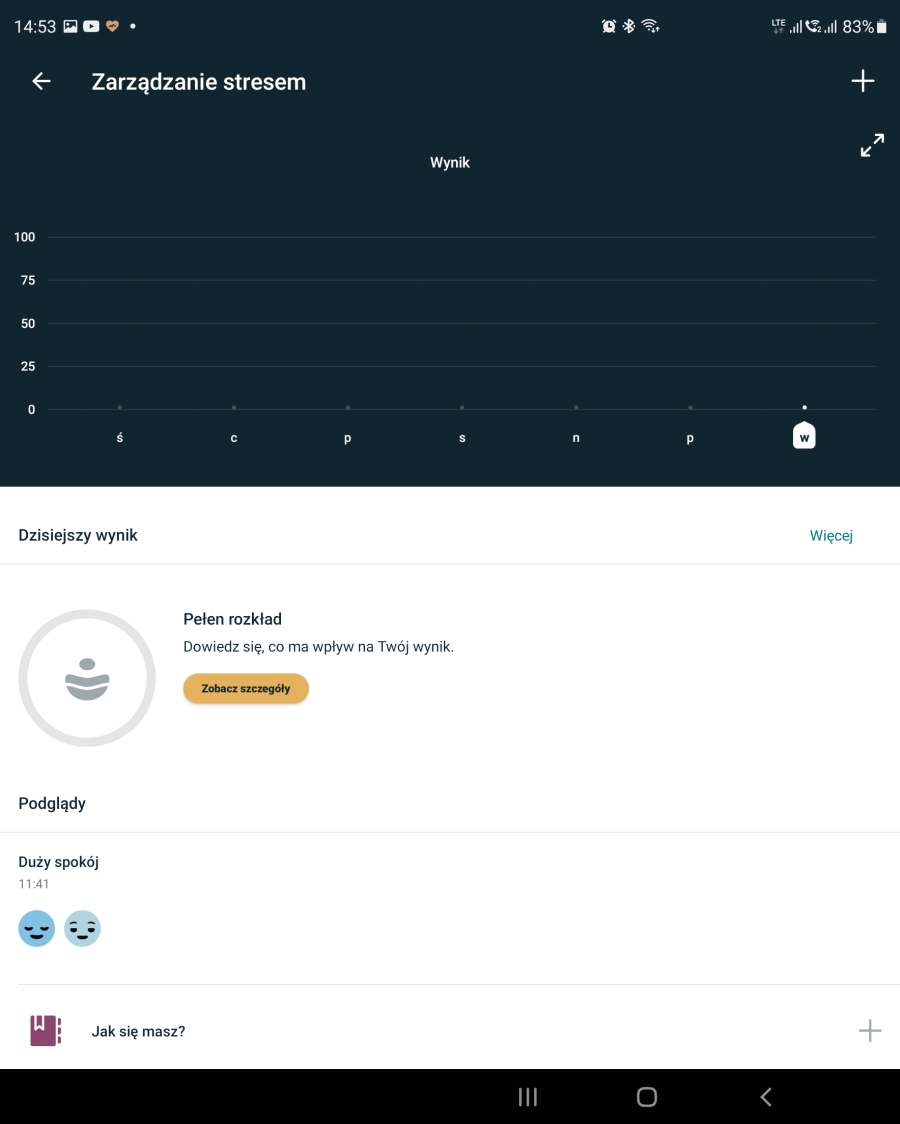 Do wykonania pomiaru służą te dwie, wspomniane wcześniej wstawki na bokach obudowy. Przykładamy do nich kciuk i palec wskazujący na 30 sekund i czekamy na rezultaty. Opaska da nam tylko ogólną informację, czy nasze serce pracuje prawidłowo. Dokładny wykres z całego pomiaru, w formacie PDF znajdziemy w aplikacji. Do tego mamy trwający trzy minuty pomiar EDA, czyli aktywności elektrodermalnej. Opaska analizuje nasz oddech, rytm serca oraz zmian w przewodnictwie skóry wynikających z działania współczulnego układu nerwowego. Celem tego pomiaru jest sprawdzenie poziomu… emocji? Ogółem im spokojniejsi jesteśmy w trakcie pomiaru i mniej odczuwamy emocji, tym lepiej. Cykliczne wykonywanie pomiarów to coś w rodzaju medytacji, której zaczynamy się stopniowo uczyć.