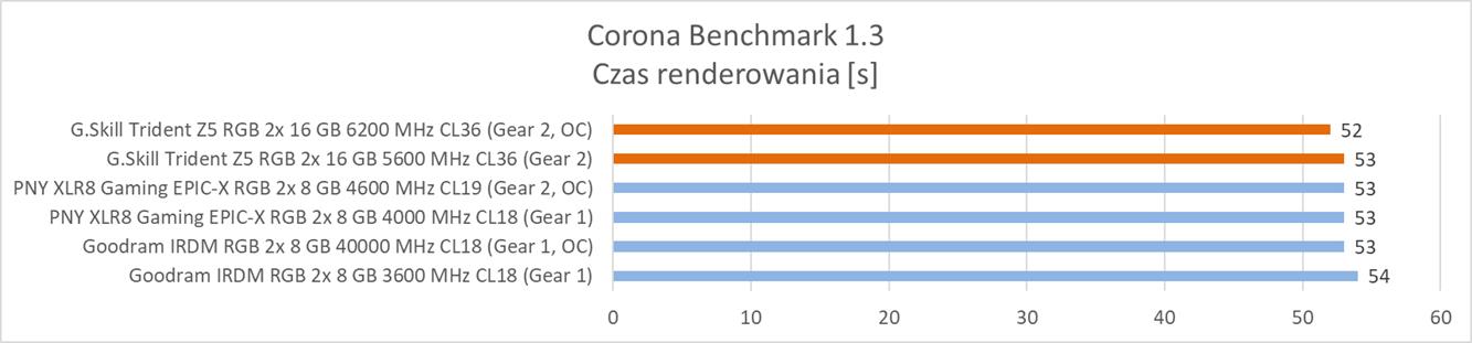 OC wykonałem po podniesieniu napięcia VDD i VDDQ do 1,30 V i przy zachowaniu fabrycznych opóźnień. W programach typu Cinebench R23, AIDA64 czy Corona stabilne było 6400 MHz, ale niestety w grach wyrzucało do pulpitu. Po zejściu do 6200 MHz pamięci działały już w pełni stabilnie we wszystkich programach czy grach.