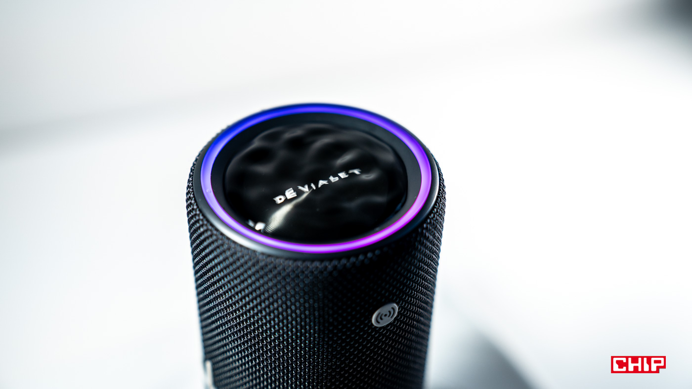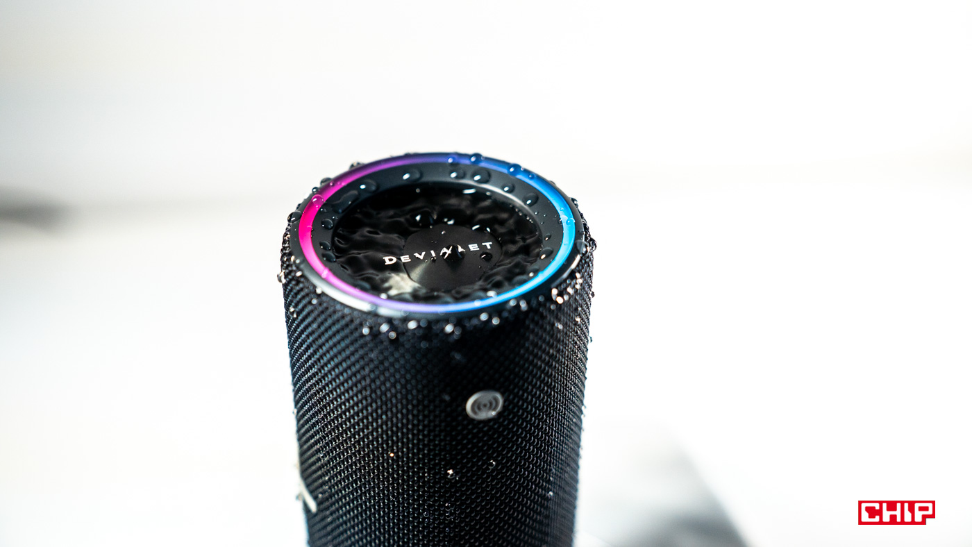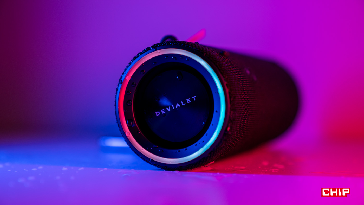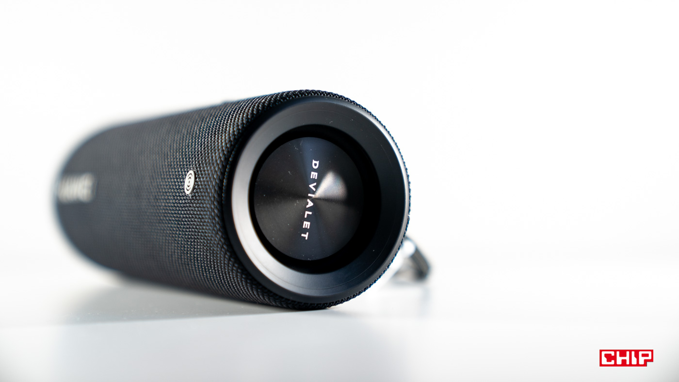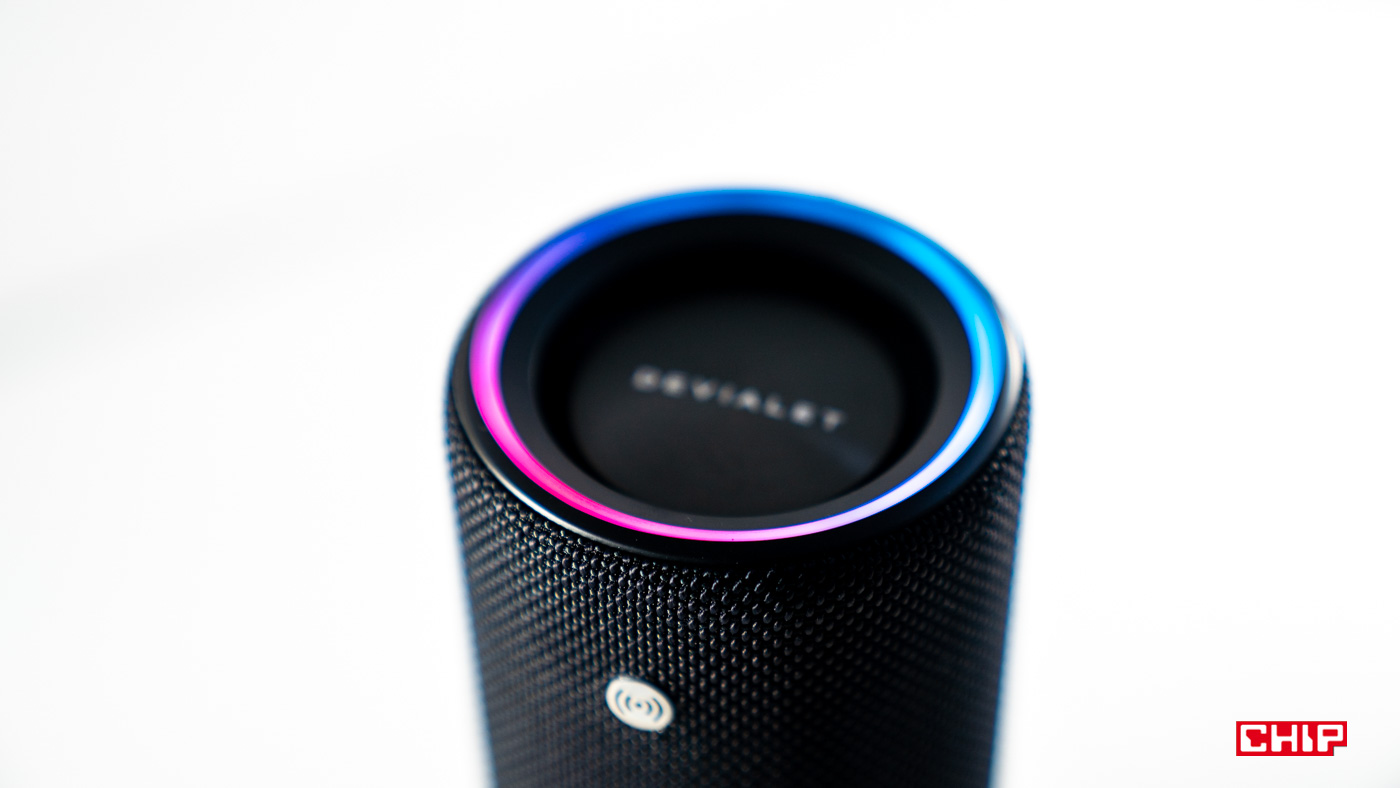Na obu końcach obudowy mamy membrany poruszające się w rytm muzyki, z logo Devialet. Stawiając głośnik pionowo, na górnym końcu mamy plastikowe obramowanie, na dolnym pokryte warstwą gumy. Na górze znajdziemy kolorowe podświetlenie, ładnie komponujące się z czarną obudową.