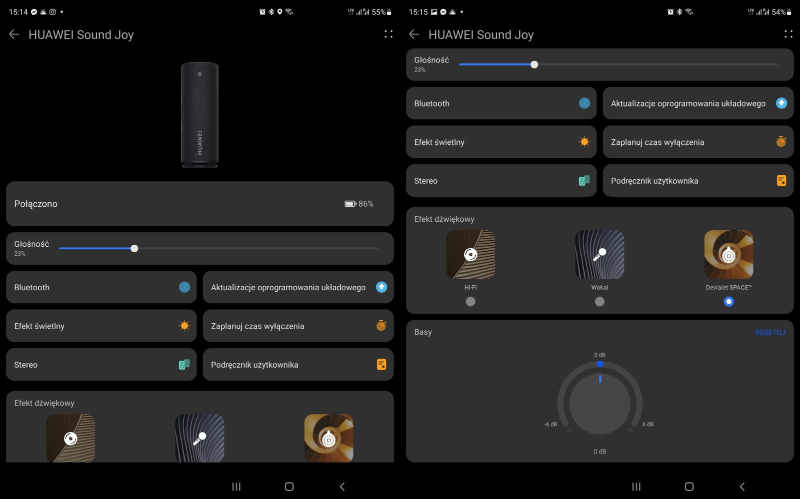 Huawei Sound Joy oferuje trzy tryby dźwięku. Hi-Fi, Voice oraz Devialet SPACE. Pierwszy podbija mocno średnie tony i delikatnie bas, odsuwając całą resztę krok w tył. Drugi robi… odwrotnie. Spłaszcza niskie tony i mocno skraca ich odtwarzanie, stawiając na tony wysokie. Co jest bardzo przydatne podczas np. prowadzenia rozmów. Trzeci z kolei stawia na głębie brzmienia. Bas wyraźnie rozchodzi się na boki i jest bardzo głęboki. Rozciągnięty, ale nadal dynamiczny. To w tym trybie zdecydowanie najwięcej słychać.