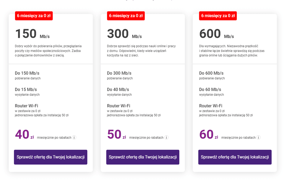 Umowę na usługę internetu stacjonarnego w Play możemy podpisać od razu na okres bezterminowy. Oznacza to, że klienci mogą zrezygnować z niej w każdej chwili. Lub też, w każdej chwili zdecydować się na szybsze łącze. Aktualnie dostępne pakiety prezentują się następująco: