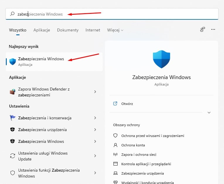 - Wpisanie “Zabezpieczenia Windows”