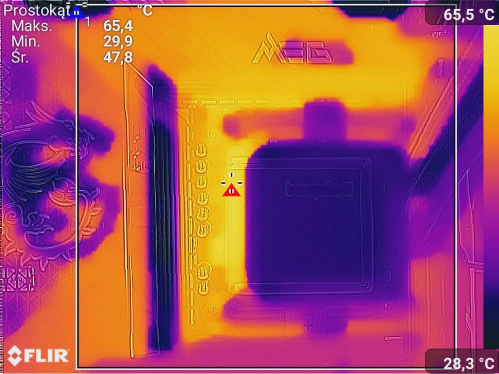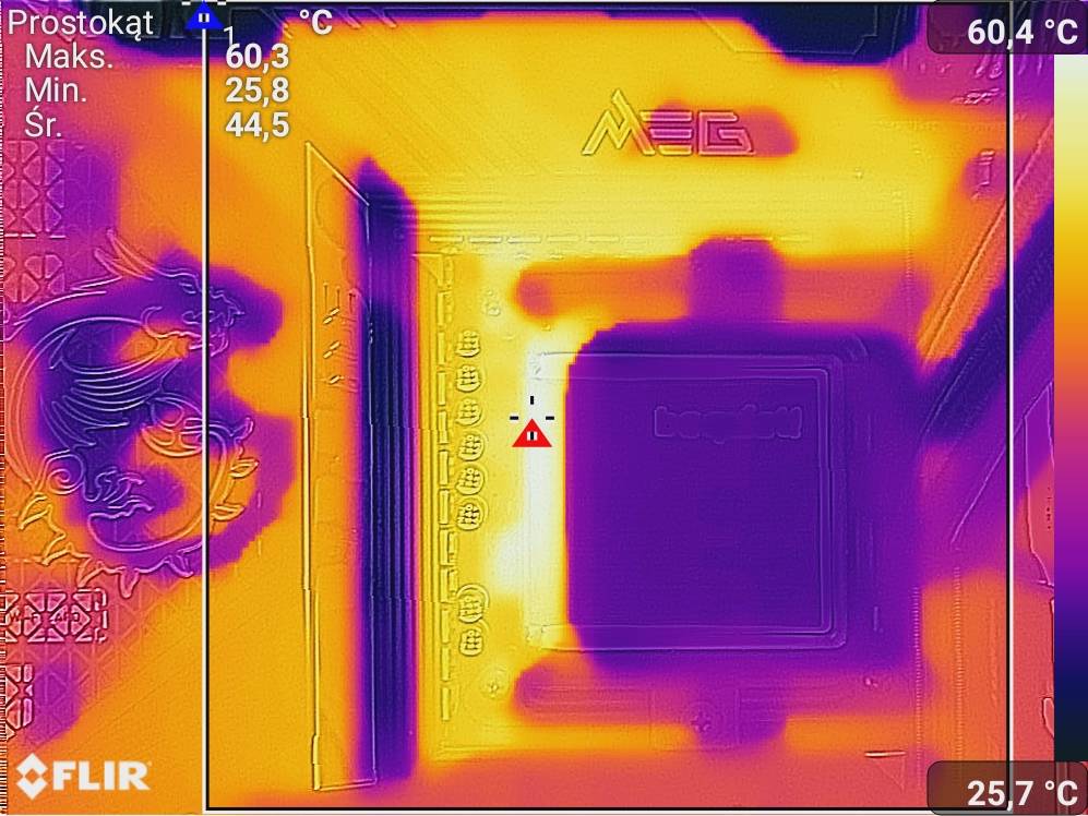 Czujnik na MSI MEG Z690 ACE wskazywał kolejno 62°C i 66°C. Temperatury są więc niskie, jedne z najniższych z jakimi miałem do czynienia. Możecie więc podkręcać procesor do granic możliwości i nie obawiać się o przegrzewanie sekcji.