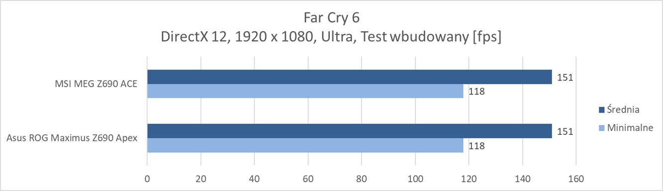 Na koniec przeprowadziłem testy w trzech grach: Far Cry 6, Shadow of the Tomb Raider oraz Metro Exodus Enhanced Edition. Testy wykonałem w rozdzielczości 1920 x 1080 px przy ustawieniach kolejno: Ultra, Najwyższe i Ultra. W przypadku Metra ustawienia RT pozostawiłem domyślne (RT: High, Reflections: Hybrid), a DLSS wyłączony. W pozostałych grach RT, DLSS czy FSR pozostały wyłączone. Testy przeprowadziłem przy wykorzystaniu wbudowanych w gry benchmarków.