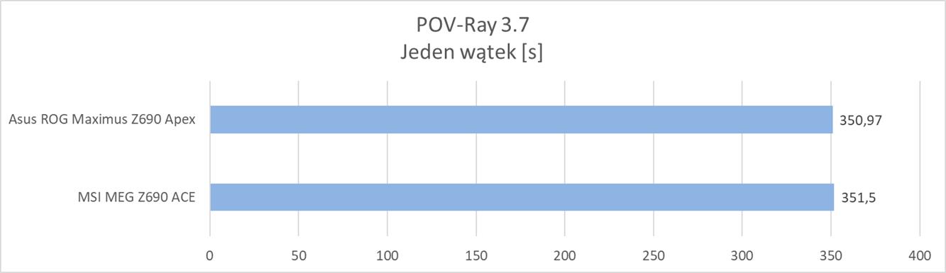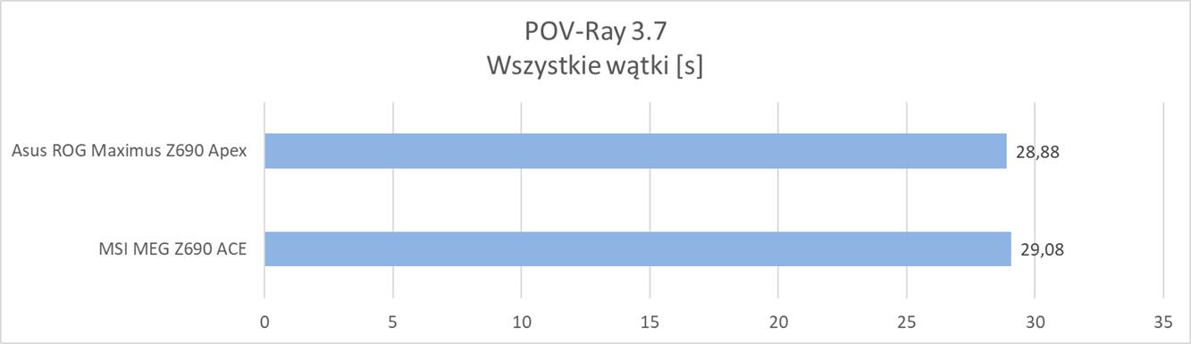 POV-Ray to kolejny program mający wbudowany benchmark. Tym razem pozwala on na tworzenie obrazów z wykorzystaniem ray tracingu i służy głównie do tworzenia grafiki 3D. W testach wykorzystałem benchmark jedno i wielowątkowy.