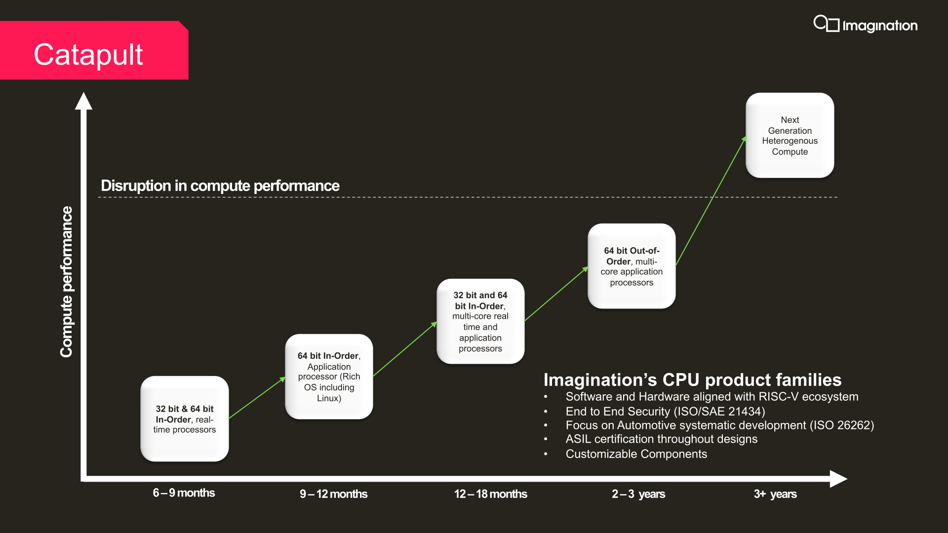 Co ciekawe, premiera całej rodziny procesorów Catapult jest nieco spóźniona, bo Imagination już od dłuższego czasu sprzedaje mikrokontrolery w ramach wysokowydajnych samochodowych procesorów graficznych w układach SoC. Dziś jednak premiera miała o tyle sens, że razem z nią do sprzedaży trafiły też procesory embedded (w formie CPU wbudowanego na stałe w daną płytę główną). Plan obejmuje wprowadzenie na rynek tych dwóch kolejnych w następnym roku.