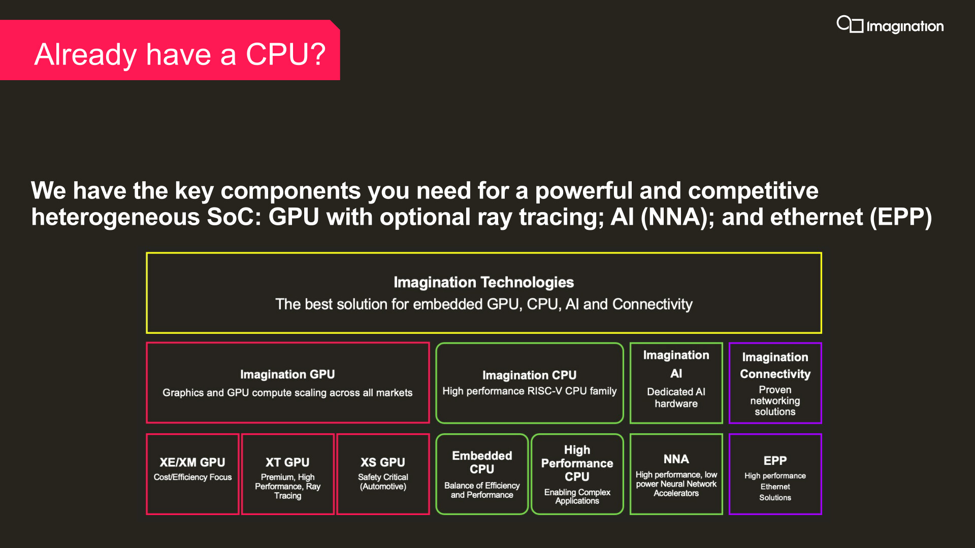 Imagination Technologies pochwalił się całą rodziną procesorów Catapult, które są zaprojektowane od podstaw dla heterogenicznych potrzeb obliczeniowych następnej generacji. Mogą być przy tym skonfigurowane pod kątem wydajności obliczeniowej lub energetycznej, dzięki czemu są odpowiednie dla szerokiej gamy rynków.