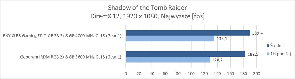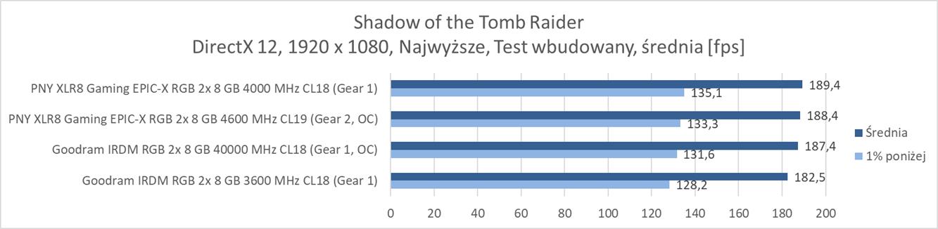PNY XLR8 Gaming EPIC-X RGB 2x 8 GB 4000 MHz CL18 kupicie za ok. 490 zł. Są to więc jedne z tańszych pamięci DDR4 o takich parametrach na dodatek z dobrze prezentującym się podświetleniem. W testach wypadły one bardzo dobrze i świetnie sprawdzają się z wydajną platformą. Co więcej na ASRock Z690 Steel Legend domyślnie działały one przy Gear 1. Pamięci po zwiększeniu opóźnień i podniesieniu napięcia podkręcicie do 4600 MHz, ale wymaga to przejścia na Gear 2, co niekoniecznie przełoży się na wyższą wydajność.