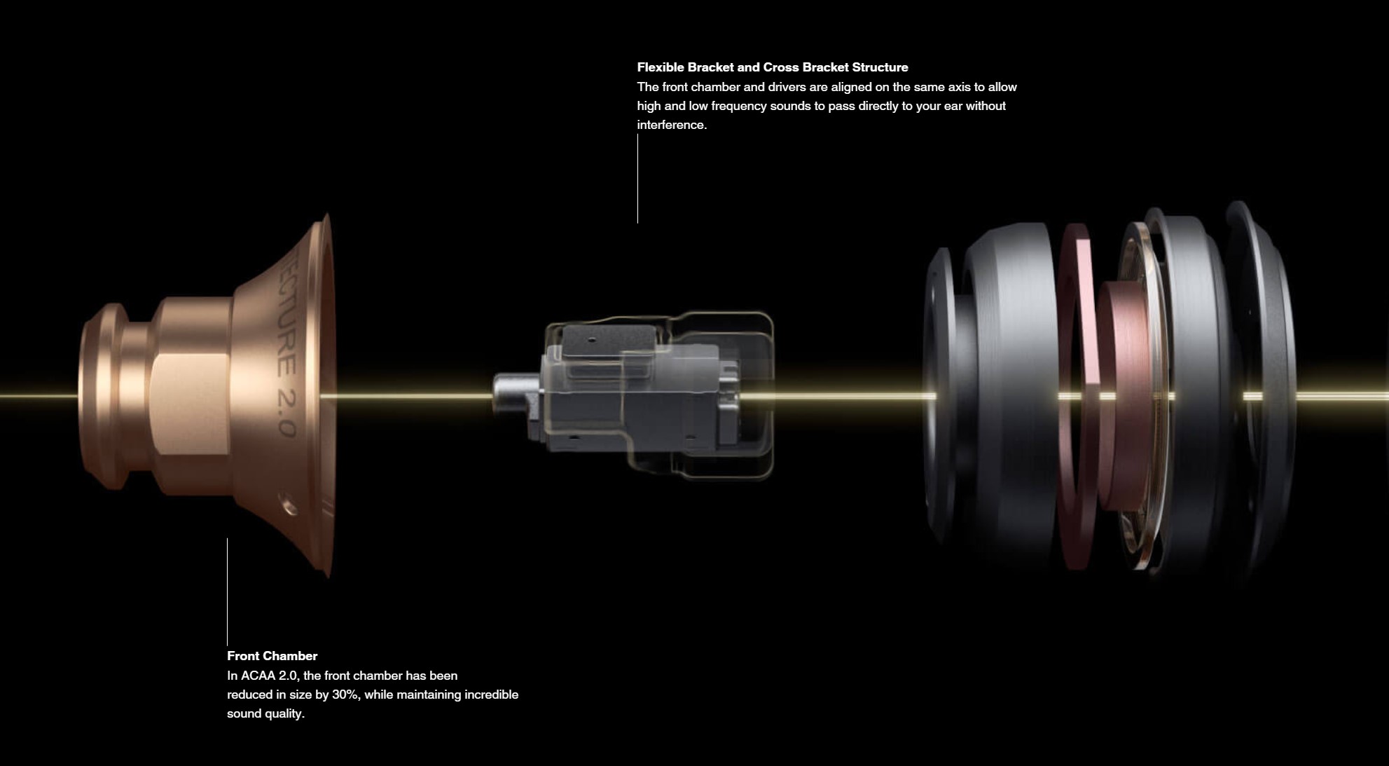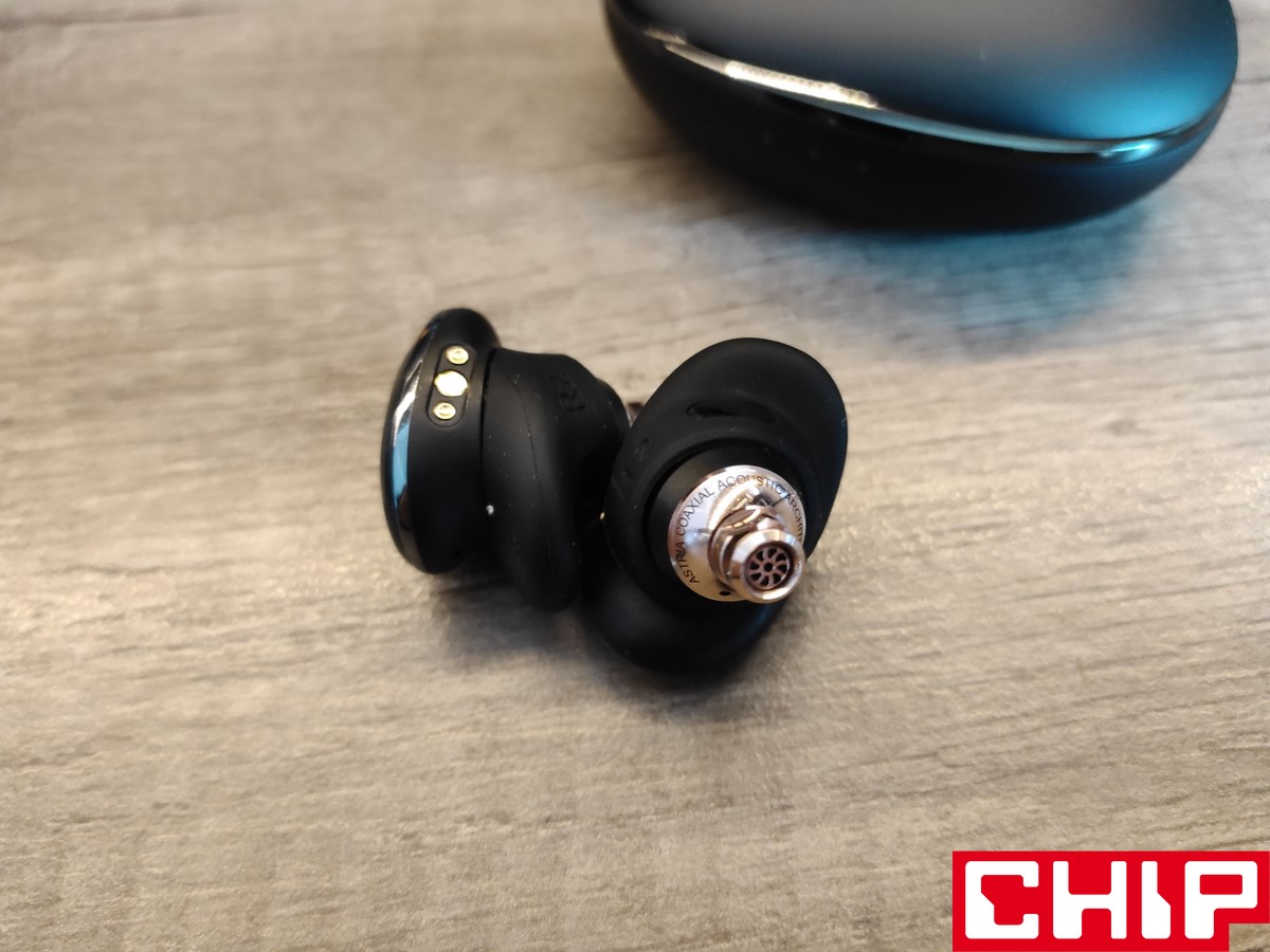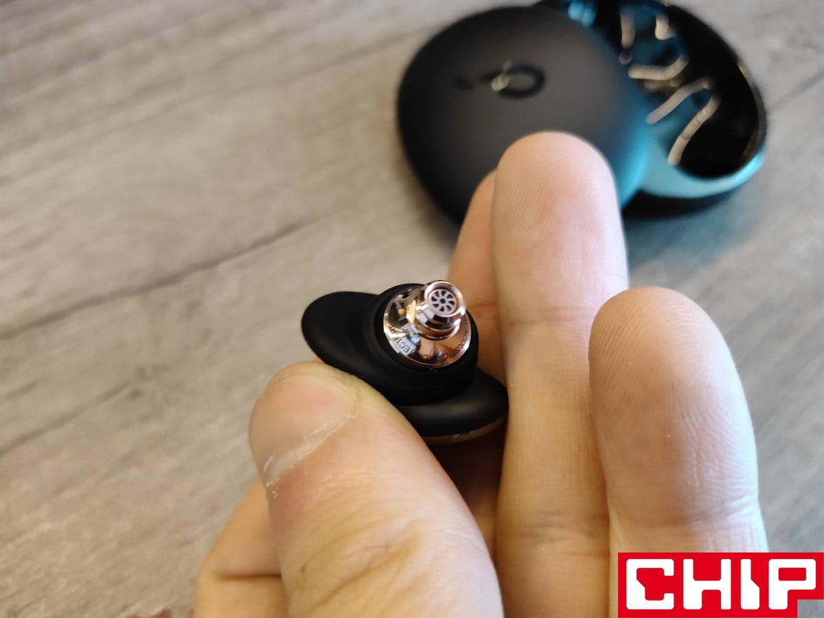 Poza tym certyfikowana klasą IPX4 konstrukcja Liberty 3 Pro została zaprojektowana specjalnie z myślą o trzymaniu się w naszych uszach w trzech punktach i to bardzo, ale to bardzo stabilnym stylu, bo poprzez gumowe skrzydełko oraz gumkę. Ta zresztą ląduje na specjalnie zakrzywionym przedłużeniu, które samo w sobie jest (jak na standard słuchawek TWS) małym dziełem sztuki sygnowanym logo producenta oraz nazwą technologii ACAA 2.0. Całość uzupełnia czujnik obecności słuchawek w uszach, którego sekcja jest też wskazówką co do montażu silikonowych skrzydełek oraz trzy złote “okręgi” (dwa piny ładujące i mały magnesik).