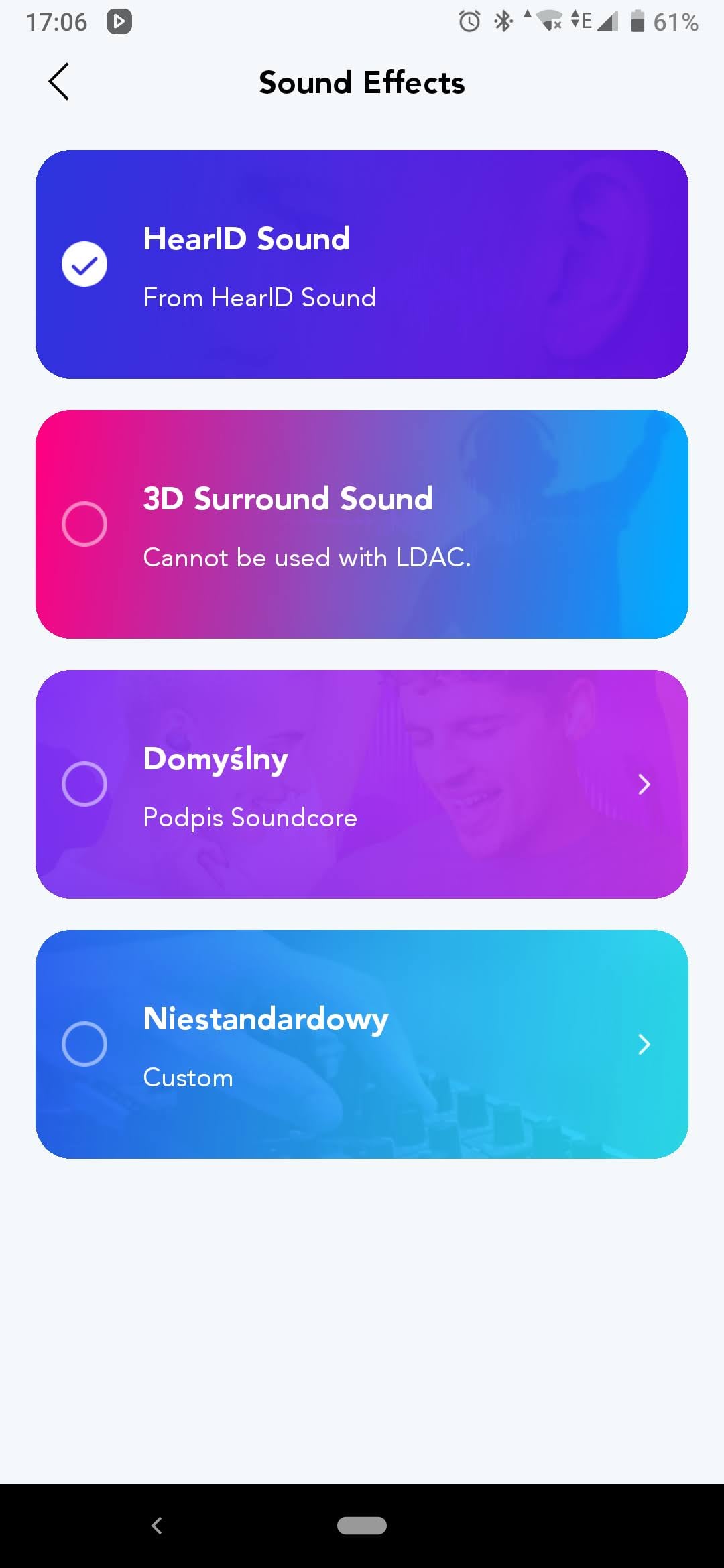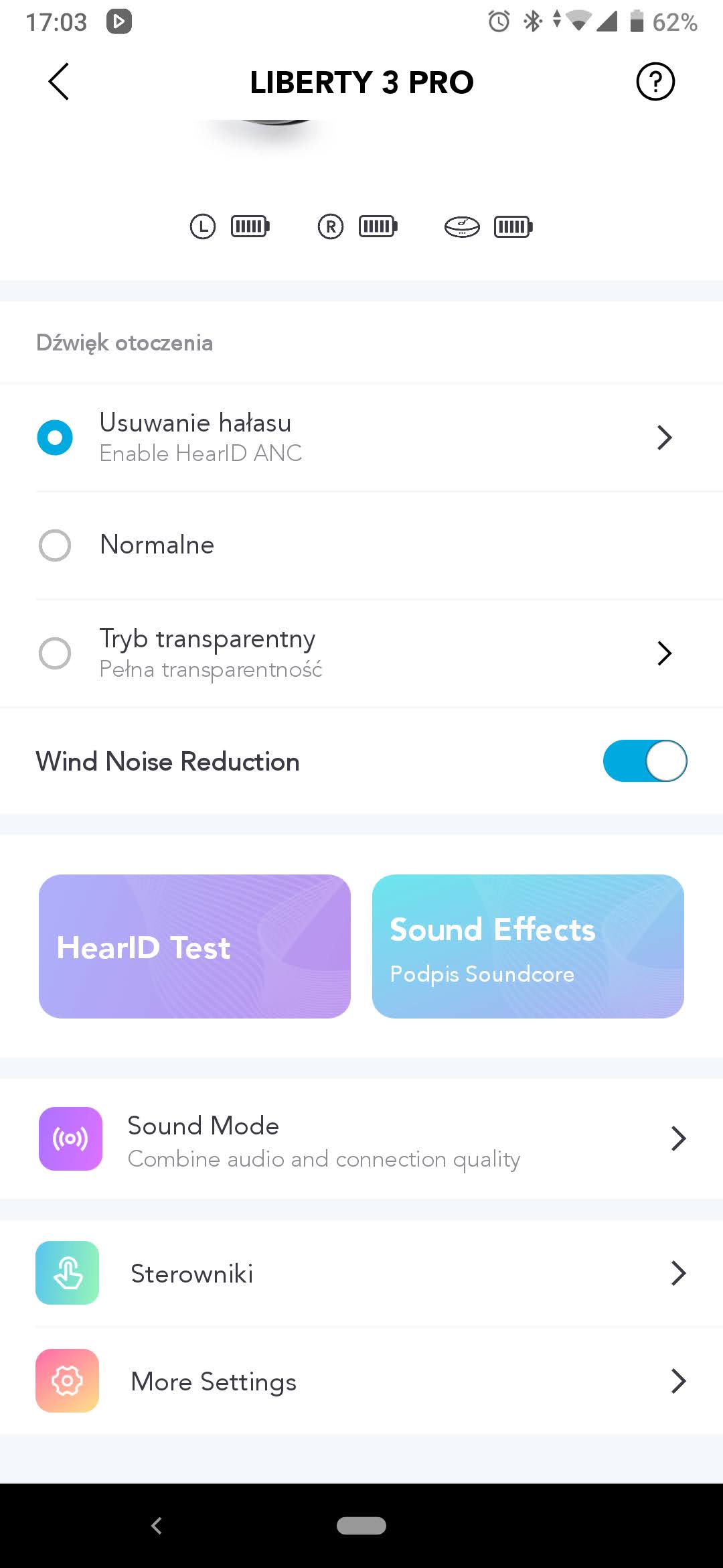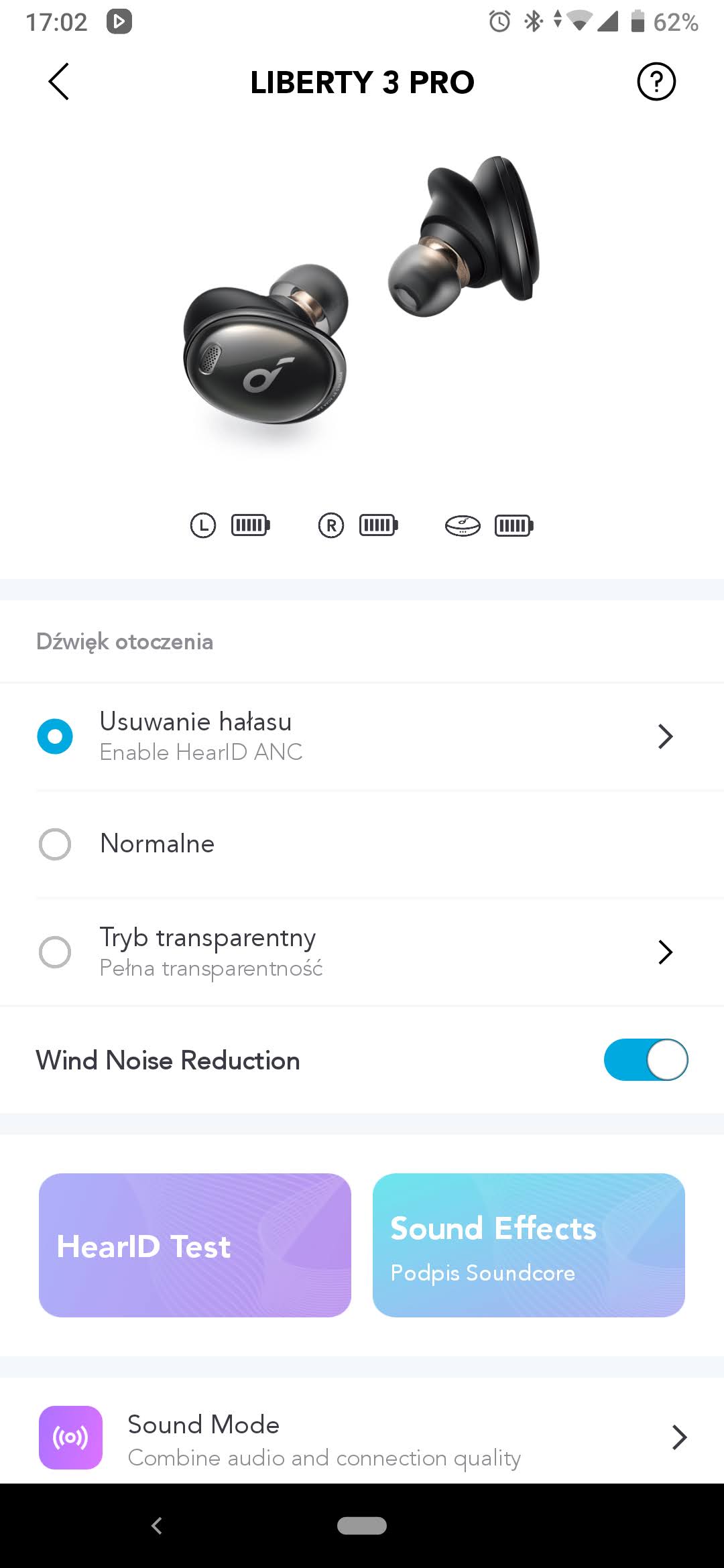 W rzeczywistości jest to jednak HUB dla wszystkich kompatybilnych produktów firmy Soundcore, który w przypadku słuchawek Liberty 3 Pro wita nas głównym menu z poziomem naładowania słuchawek i etui, opcjami co do dźwięku otoczenia, ustawieniami brzmienia, testem HearID, konfiguratorem funkcji dotykowych, opcjami dodatkowymi i trybem dźwięku.