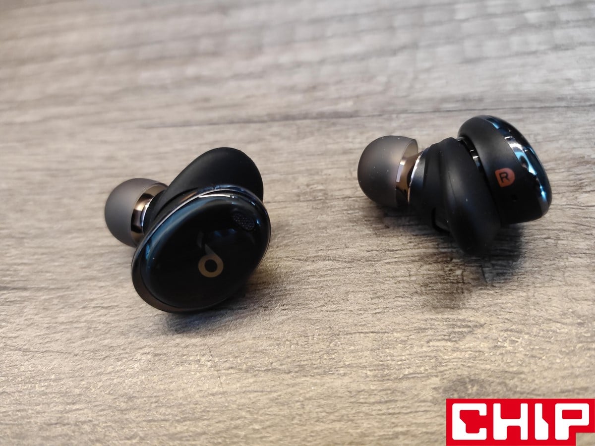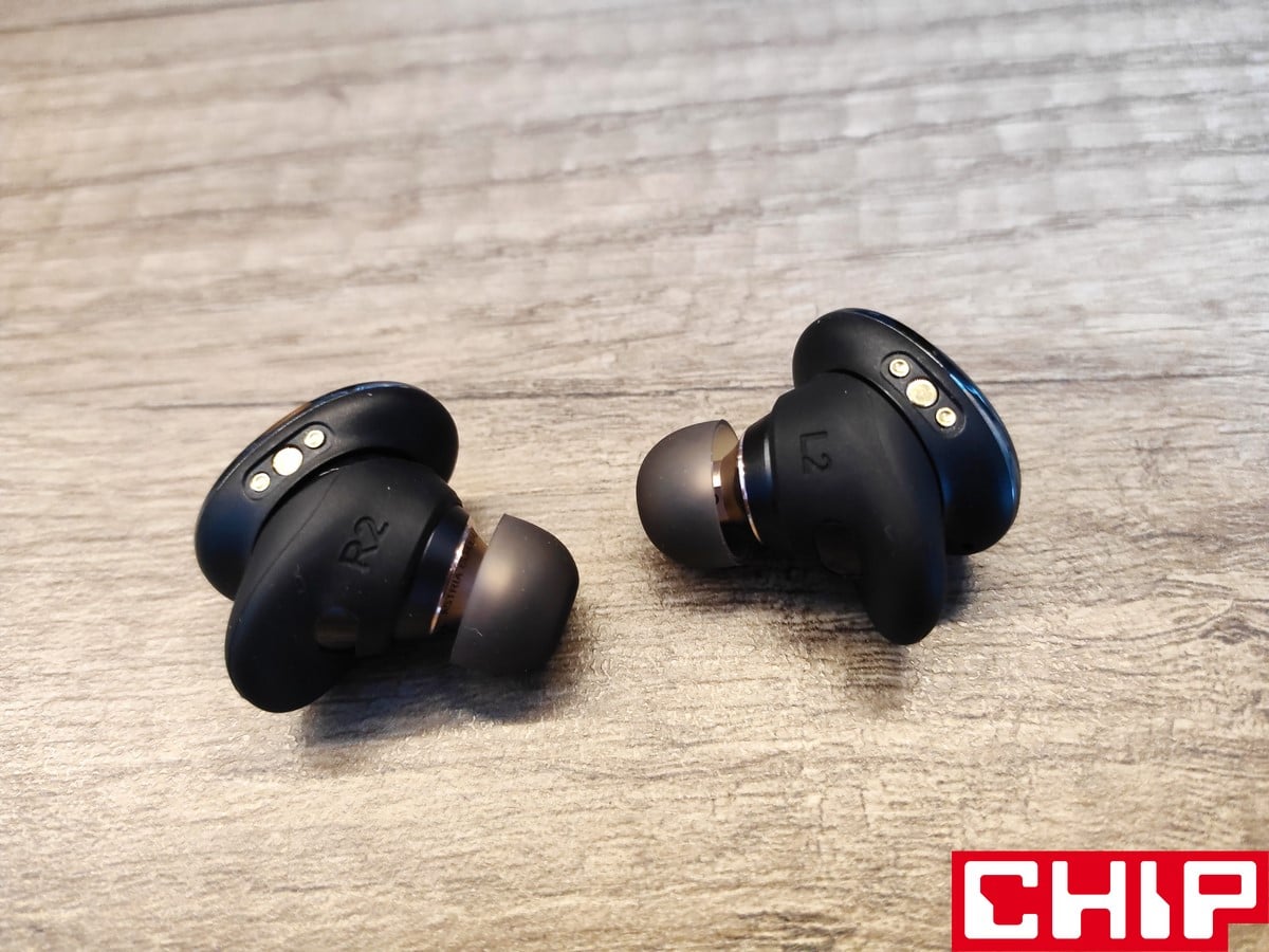Jeśli idzie o same słuchawki, te zdecydowanie nawiązują kształtem swojej zewnętrznej części (z czujnikami dotykowymi) do jajowatego kształtu etui. W przeciwieństwie do niego jednak, postawiły na śliski plastik, który znacznie łatwiej się brudzi i którego w wersji czarnej ozdabia złota wstawka z logo producenta i owalna metalowa siateczka. Ta skrywa pod sobą mikrofon (dodatkowe dwa znajdują się też tuż przy uchu oraz na górnej części obudowy w obu słuchawkach), i służy również do wyrównywania ciśnienia.