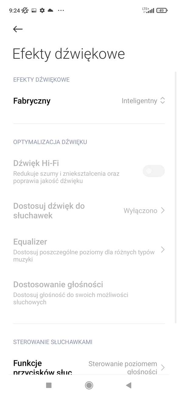 W ustawieniach możemy znaleźć manualny equalizer, ale nie tylko. Jest również możliwość automatycznego dostosowania głośności, dostosowania barwy dźwięku do konkretnych słuchawek oraz tzw. Dźwięk Hi-Fi. Equalizer sprawdza się bardzo dobrze, pozostałe opcje – różnie… Polecam przetestować je samemu.