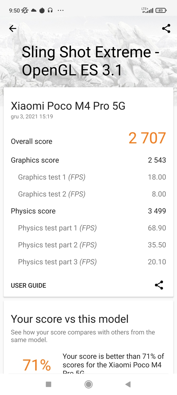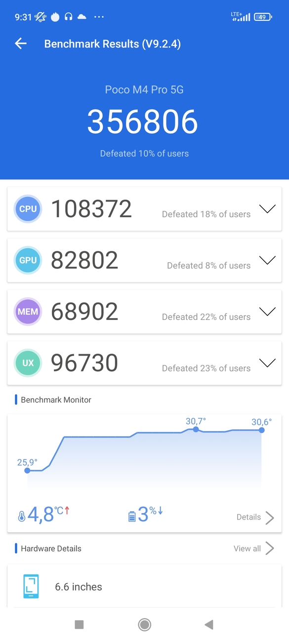 Smartfon został wyposażony w procesor MediaTek Dimensity 810, grafikę Mali-G57 oraz 4 lub 6 GB pamięci RAM (w zależności od wersji). Ja do testów dostałem droższą wersję, z 6 GB pamięci RAM i poniższe wyniki testów benchmarkowych odnoszą się właśnie do tej wersji. A te nie są zaskakujące i pasują do ceny urządzenia. Jak widać są one nieco lepsze niż w przypadku Realme 8i, który jednak jest jeszcze tańszy.
