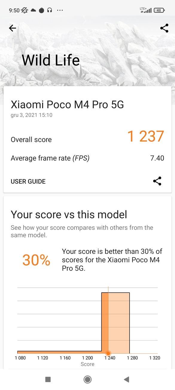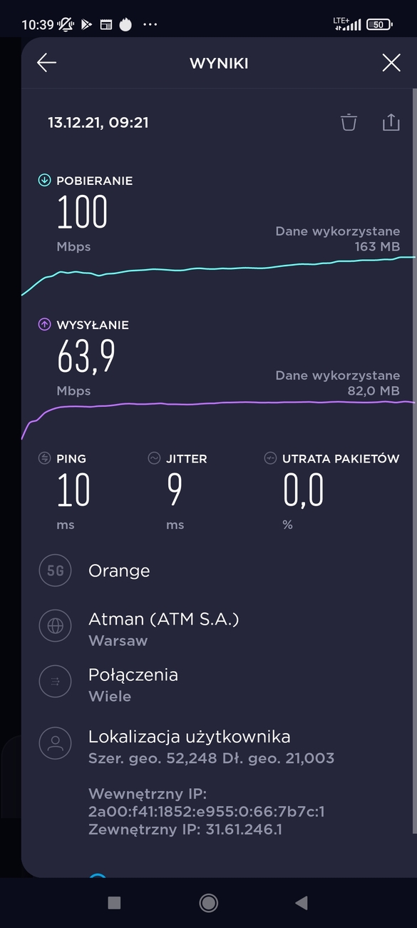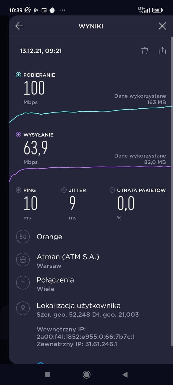 POCO M4 Pro 5G jest hybrydowym Dual SIMem, co oznacza, że żeby korzystać z dwóch kart SIM, musimy wyjąć kartę pamięci. Dlatego właśnie rekomenduję zakup wersji ze 128 GB pamięci wewnętrznej. Poza LTE, smartfon obsługuje również 5G oraz Wi-Fi 802.11 a/b/g/n/ac. W programie Speedtest w sieci Orange w centrum Warszawy smartfon osiągnął 100 Mb/s w przypadku pobierania danych i niespełna 64 Mb/s w przypadku ich wysyłania. Tragedii nie ma 😉