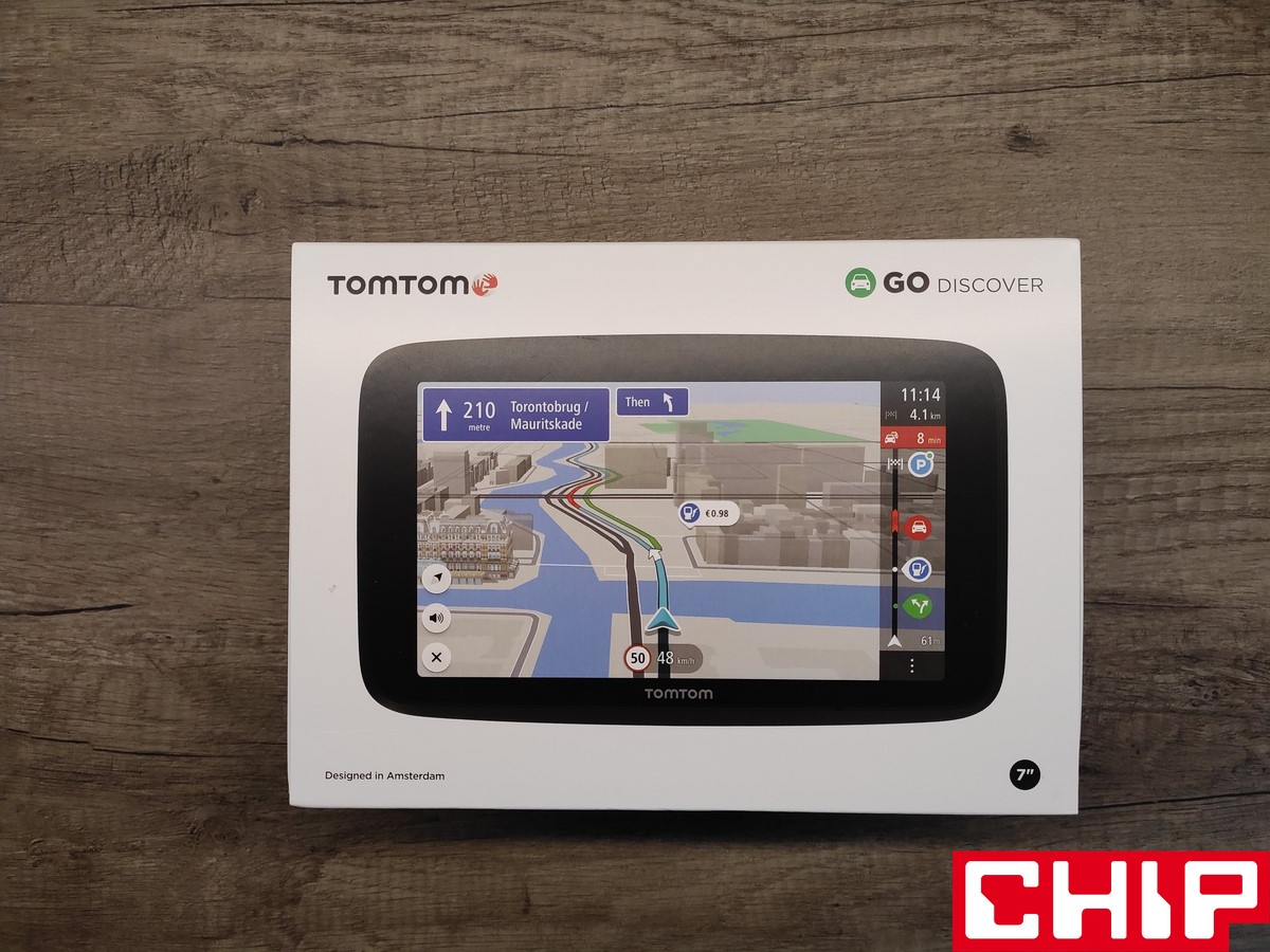 Przechodząc od razu do rzeczy, nawigacja TomTom GO Discover trafia do nas w pokaźnym pudełku, ukazującym z samego przodu bliski rozmiarom (nieco mniejszy) tablet o grubych ramkach.