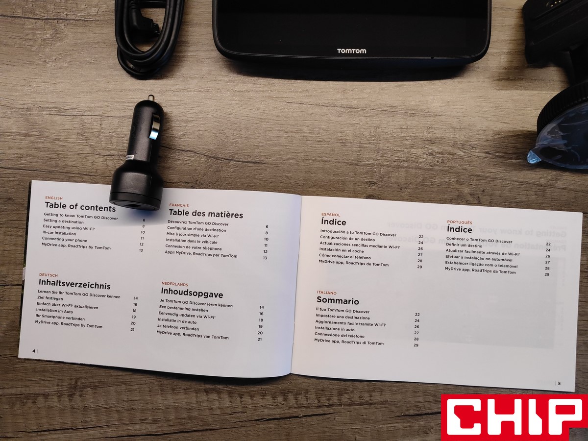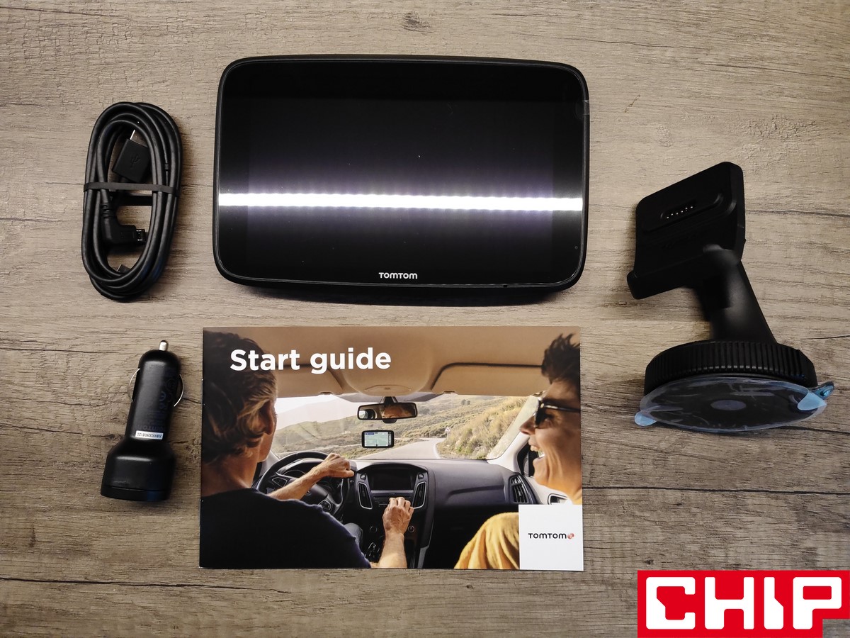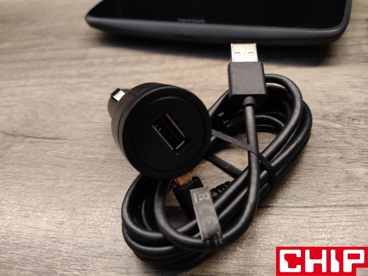Wewnątrz pudełka nic nas nie zaskoczy, bo oprócz uchwytu montażowego w formie przyssawki, znajdziemy tylko ładowarkę samochodową z przewodem USB-A do microUSB oraz instrukcję obsługi. W moim egzemplarzu zabrakło tej w języku polskim, ale dostęp do niej możecie uzyskać na oficjalnej stronie producenta. Pod kątem specyfikacji (musicie wiedzieć, że TomTom GO Discover, to po prostu “specjalny tablet” z autorskim systemem operacyjnym), łączy w sobie 2 GB pamięci operacyjnej i 32 GB pamięci wewnętrznej.