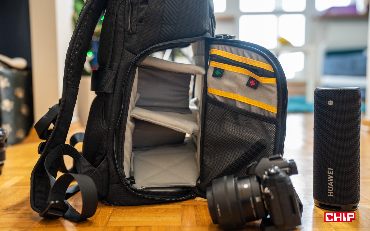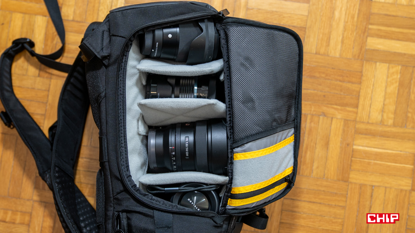 Głównym elementem plecaka są właśnie kieszenie boczne z wydzielonymi przegrodami. W układzie fabrycznym są to trzy przegrody z dnem oraz jedna przebiegająca przez całą szerokość plecaka. Zazwyczaj do niej wkładałem głośnik Huawei Sound Joy, a do pozostałych trafiał aparat, trzy obiektywy oraz mysz Logitech MX Master 3. W takim układzie przegród, aparat możemy umieścić bez obiektywu lub z krótkim obiektywem typu 50mm F/1.8, kierując go prostopadle do dna przegrody. Najdłuższy obiektyw, jaki zmieścimy w przegrodach, może mieć ok 140mm długości. Więc na spokojnie, bez przekładania przegród, włożymy tu obiektywy 24-70mm F/2.8 Canona, Sigmy i Sony lub 16-35mm. Dłuższe teleobiektywy też się zmieszczą.