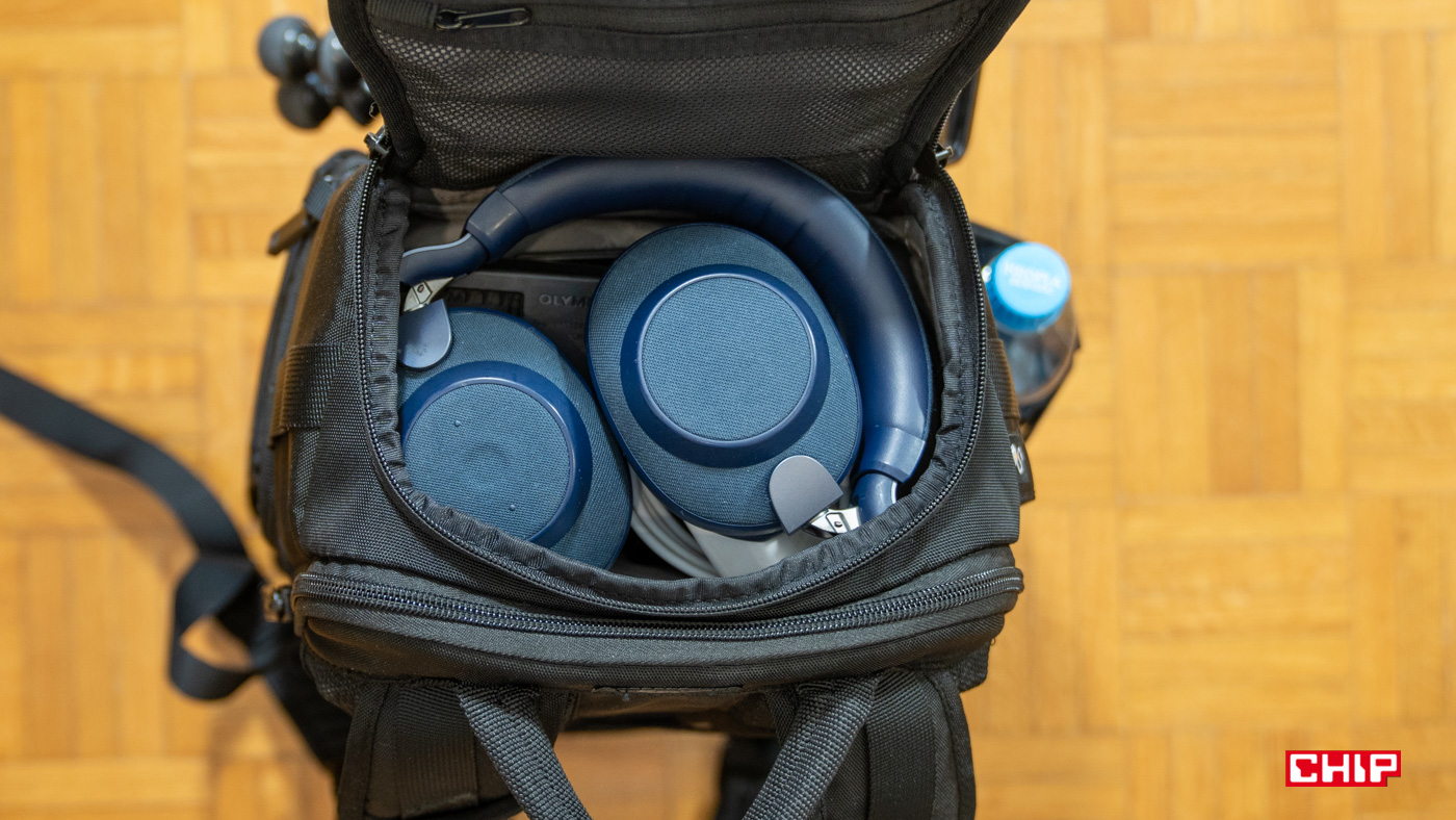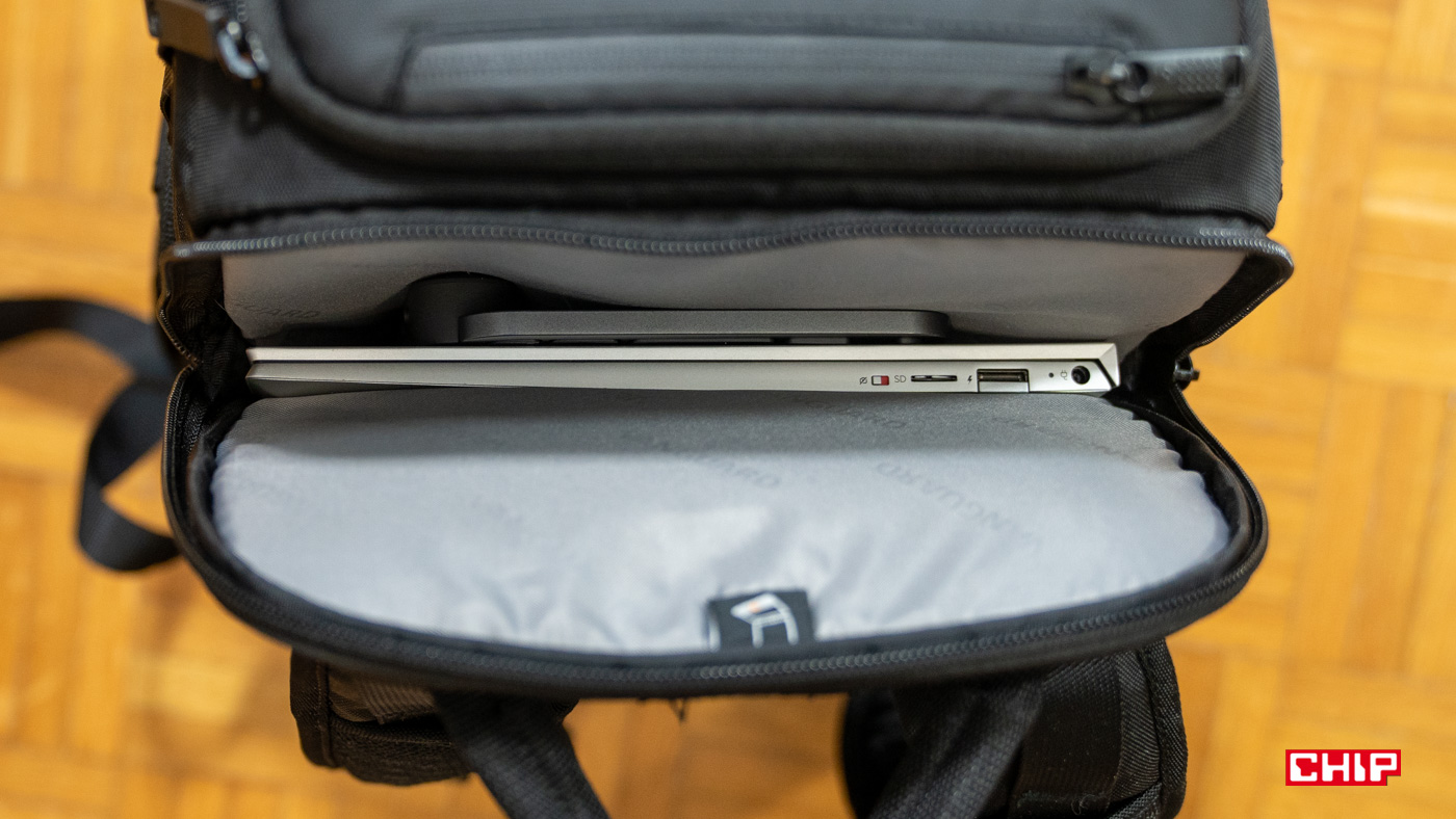 Zacznijmy od rzeczy największych. Na plecach umieszczona została duża kieszeń na laptopa. Faktycznie mieści 15-calowe konstrukcje, bez problemu, jak również dyskomfortu noszenia, mieszczę tam 14-calowego laptopa i małą klawiaturę Logitech MX Keys Mini.