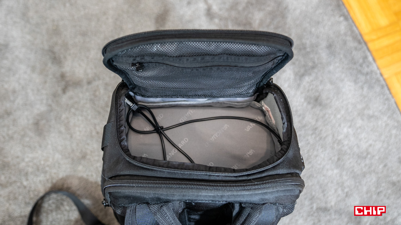 Na górze mamy dwie kieszenie. Jedna nieduża i płaska. Druga głęboka, stworzona z myślą o powerbanku. Możemy do niego podłączyć fabrycznie zamontowany kabel, którego wyjście z portem USB-A jest na zewnątrz plecaka. Dzięki temu łatwo możemy się do niego podłączyć. Kieszeń jest spora. Mieszczę tam potężny powerbank 20 000 mAh i zazwyczaj dokładam do niego sporą ładowarkę do laptopa/smartfonu, dysk SSD, uniwersalną ładowarkę, ładowarkę od aparatu i komplet kabli.