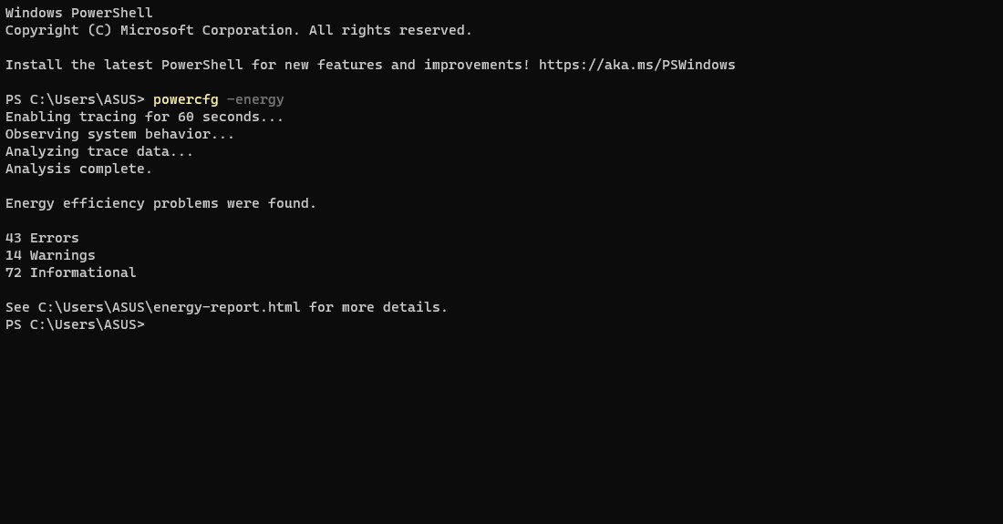 Właściciele laptopów mogą też skorzystać ze skanu systemu w myśl zużycia energii, co umożliwia komenda powercfg z parametrem -energy. Wynik tego testu zapewni Wam m.in. dostęp do szczegółowej listy problemów, których rozwiązanie powinno poprawić zużycie energii przez Was system, więc tym samym działanie na jednym ładowaniu akumulatora laptopa.