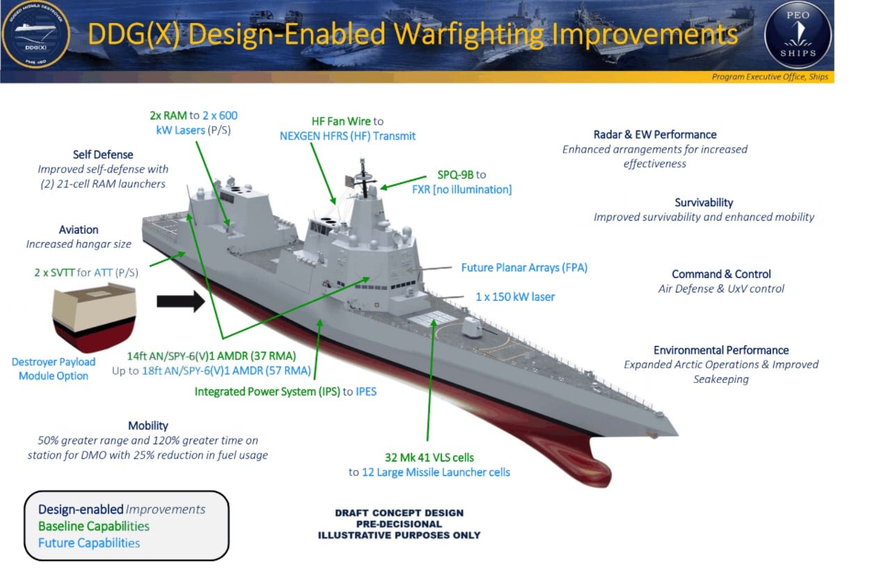 DDG(X) zostanie oparty o platformę zdolną do zasilenia zarówno ukierunkowanej broni energii nowej generacji, jak i czujników wymagających dużej mocy. Wykorzysta rozwinięty system bojowy opracowany na podstawie obecnego w Arleigh Burke w wersji Flight III (Baseline 10 Aegis). Ten zostanie opakowany w nowy projekt kadłuba (jeszcze nie ustalono, jaki dokładnie) i będzie mógł się rozwijać w miarę ewolucji systemów uzbrojenia. DDG(X) doczeka się też ulepszonego systemu napędowego obecnego w niszczycielach rakietowych klasy Zumwalt, który będzie musiał generować ogromne ilości mocy dla laserów i nowych czujników.