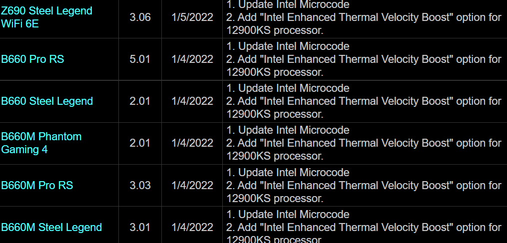 Nie są to byle jakie poziomy, dlatego producenci niektórych płyt głównych są zmuszeni zapewnić i9-12900KS specjalną funkcję. ASRock już tego dokonał, zapewniając kilku swoim modelom aktualizację BIOSu, wprowadzającą “Enhanced Thermal Velocity Boost” specjalnie dla tego właśnie procesora. Minęły już bowiem czasy 11. generacji Core, które wspierały tę funkcję natywnie.