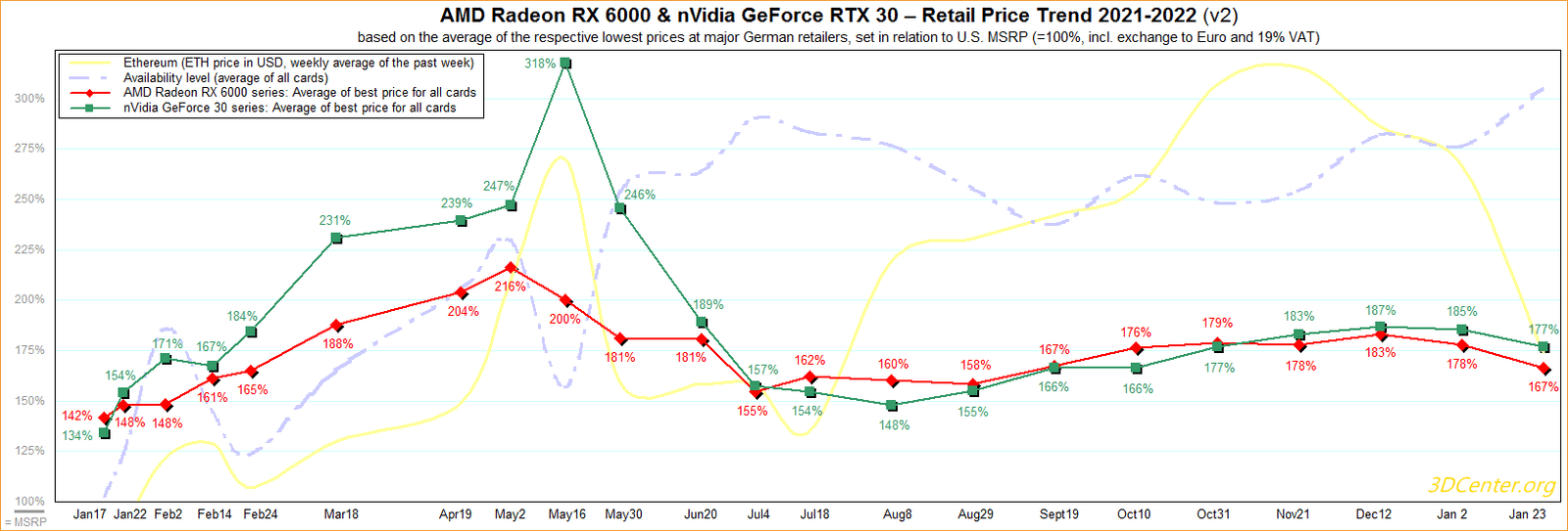 Od połowy grudnia ceny kart graficznych w części europejskich sklepów zaczęły spadać. Tak też średnia cena GeForce RTX 3000 spadła z 187% do 177%, a Radeonów RX 6000 z 183 do 167%, co wskazuje, że obecnie łatwiej jest dorwać tańszego Radeona, jeśli idzie o czysty stosunek ceny do wydajności. Ciągle jednak modele są dużo za drogie, bo względem kwot detalicznych są droższe o wspomniane 77 i 67%.