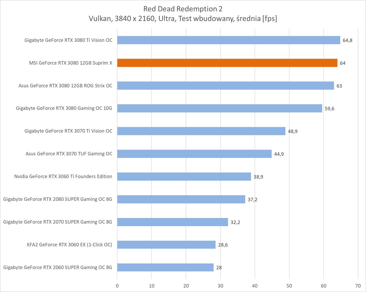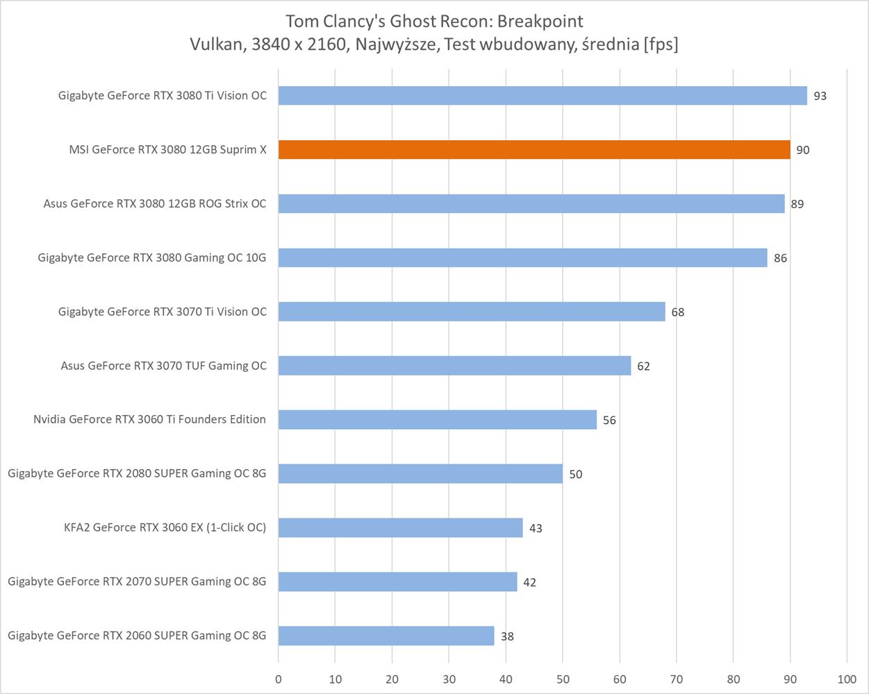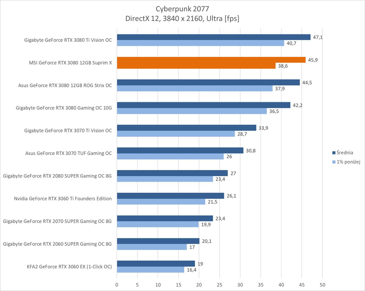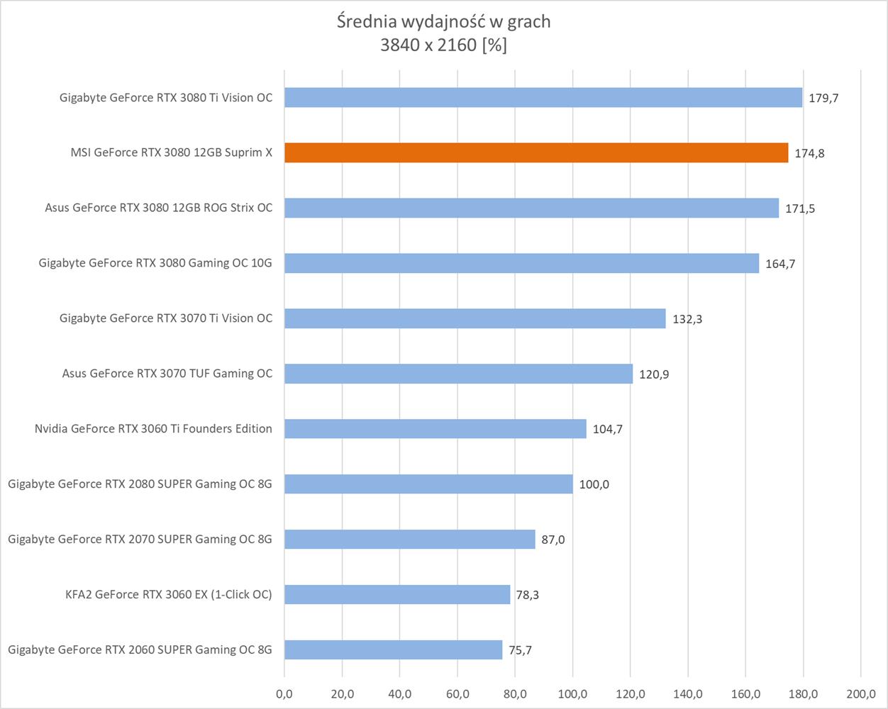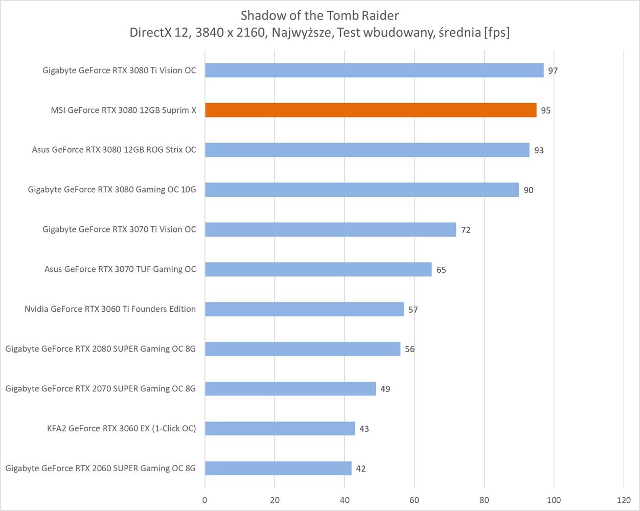 W testach w rozdzielczości 3840 x 2160 można już zauważyć spadki fps w niektórych tytułach, jednak w dalszym ciągu MSI GeForce RTX 3080 12GB Suprim X plasuje się na drugim miejscu.