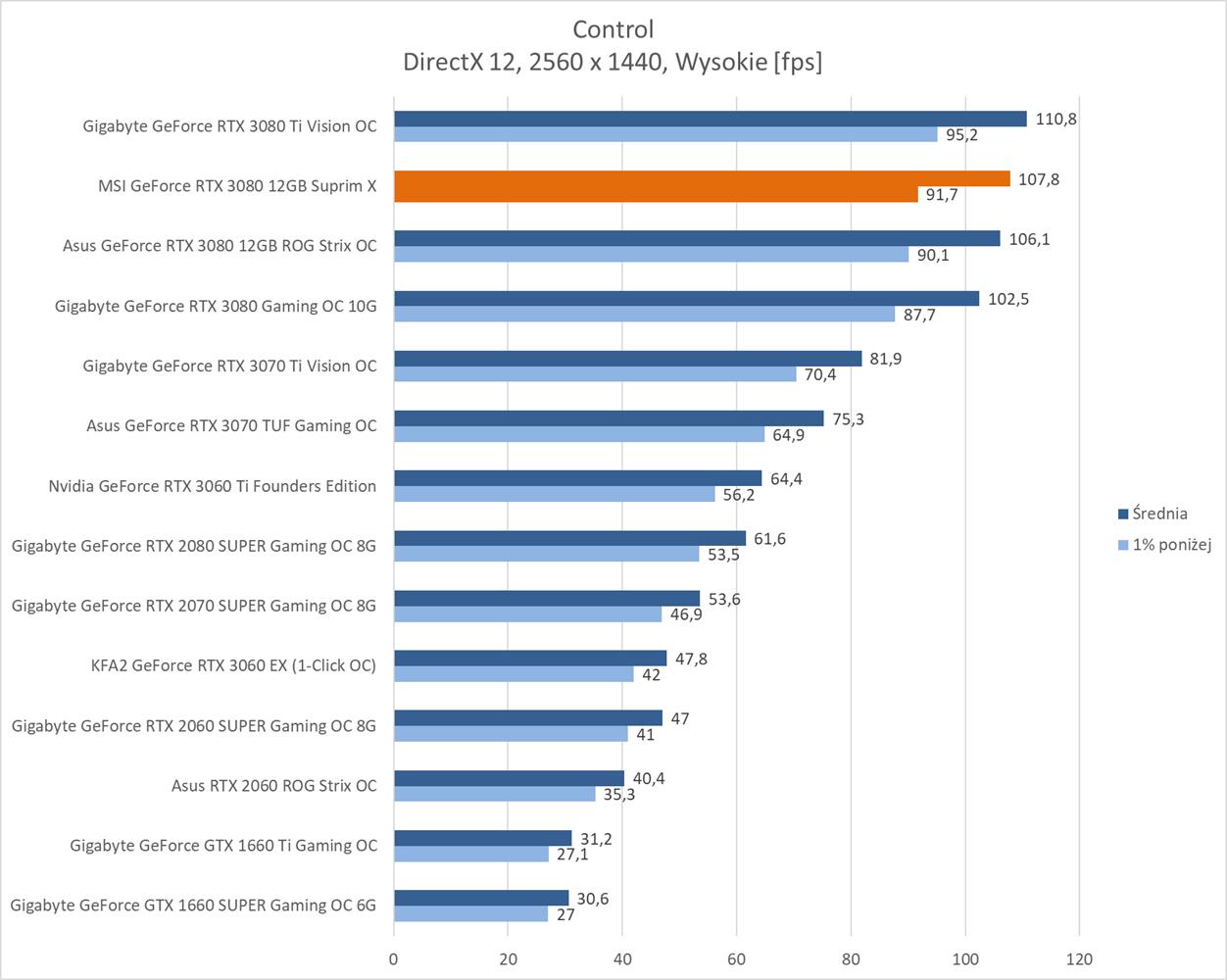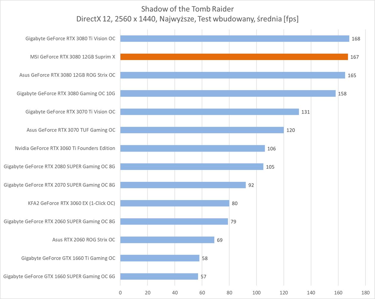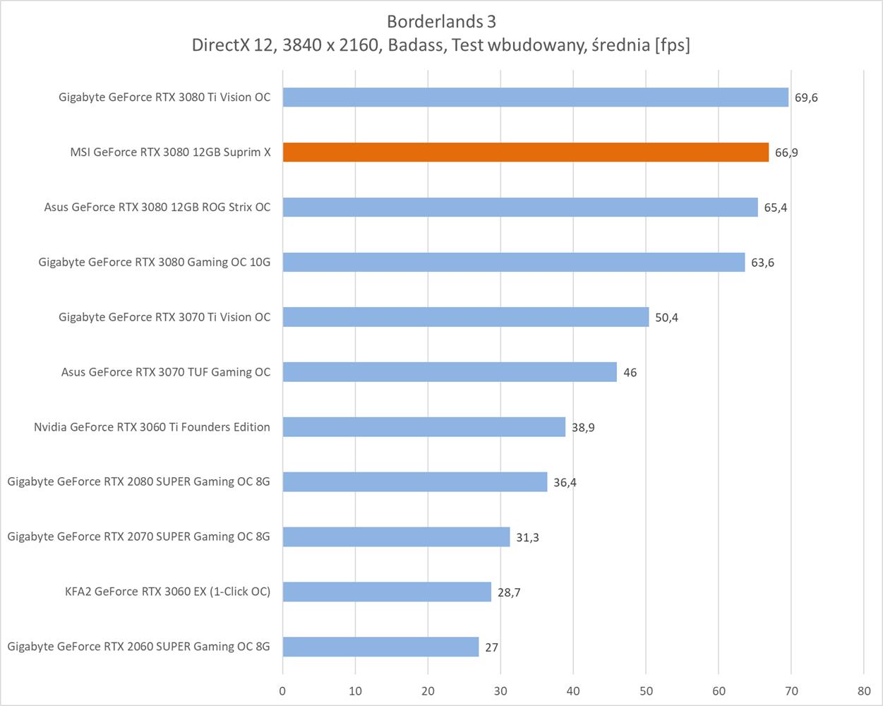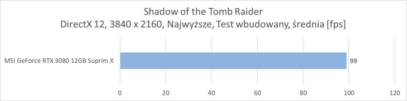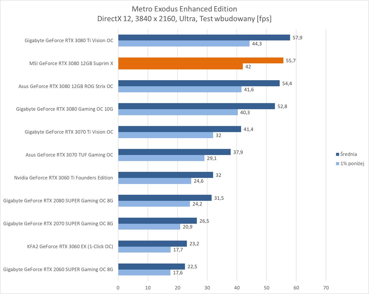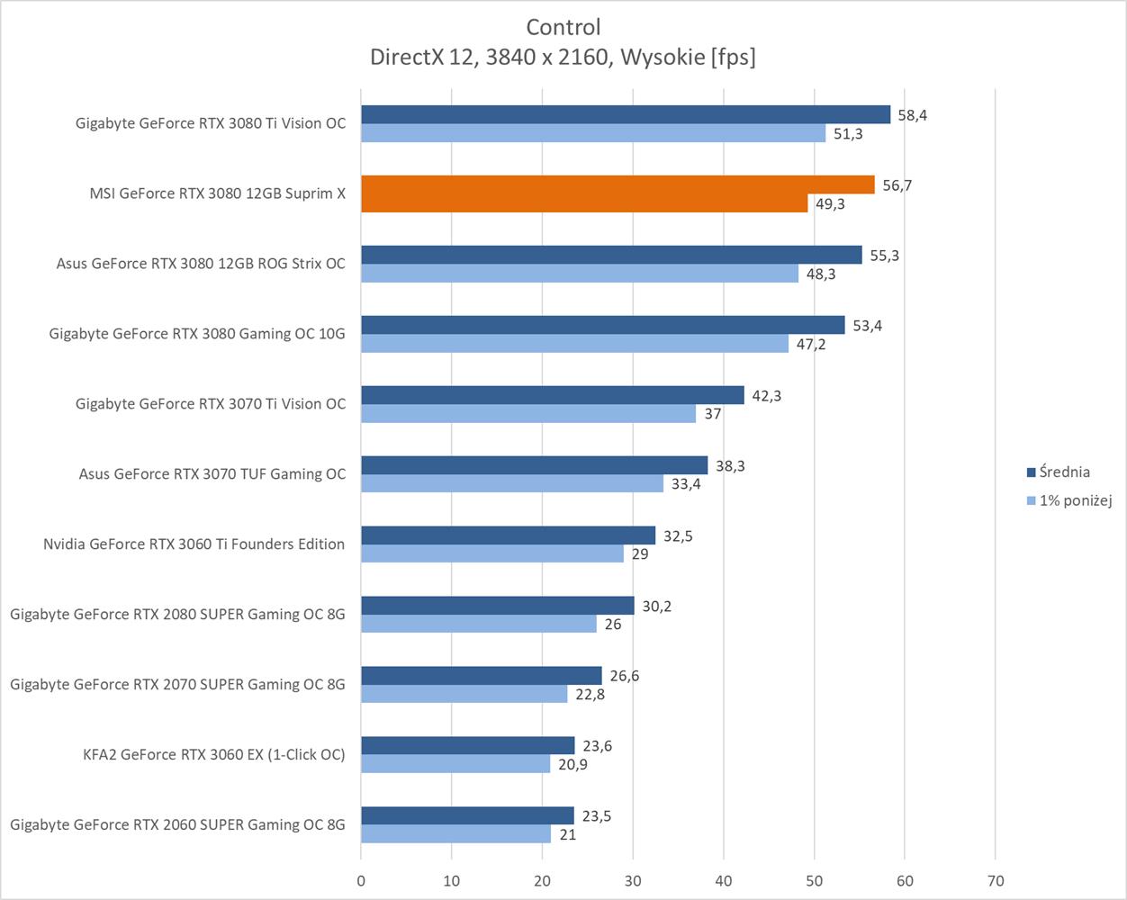 W testach w rozdzielczości 3840 x 2160 można już zauważyć spadki fps w niektórych tytułach, jednak w dalszym ciągu MSI GeForce RTX 3080 12GB Suprim X plasuje się na drugim miejscu.