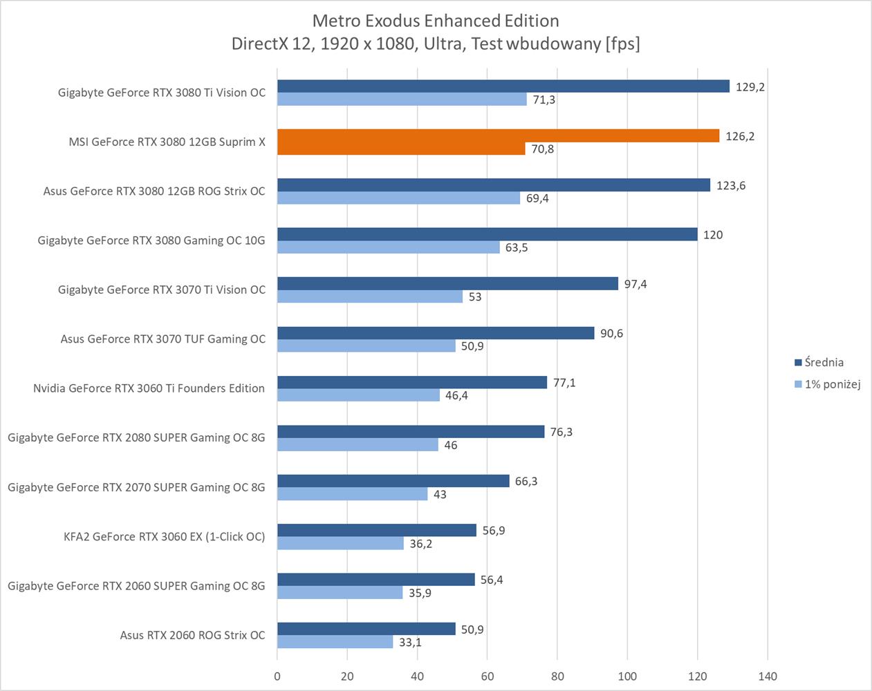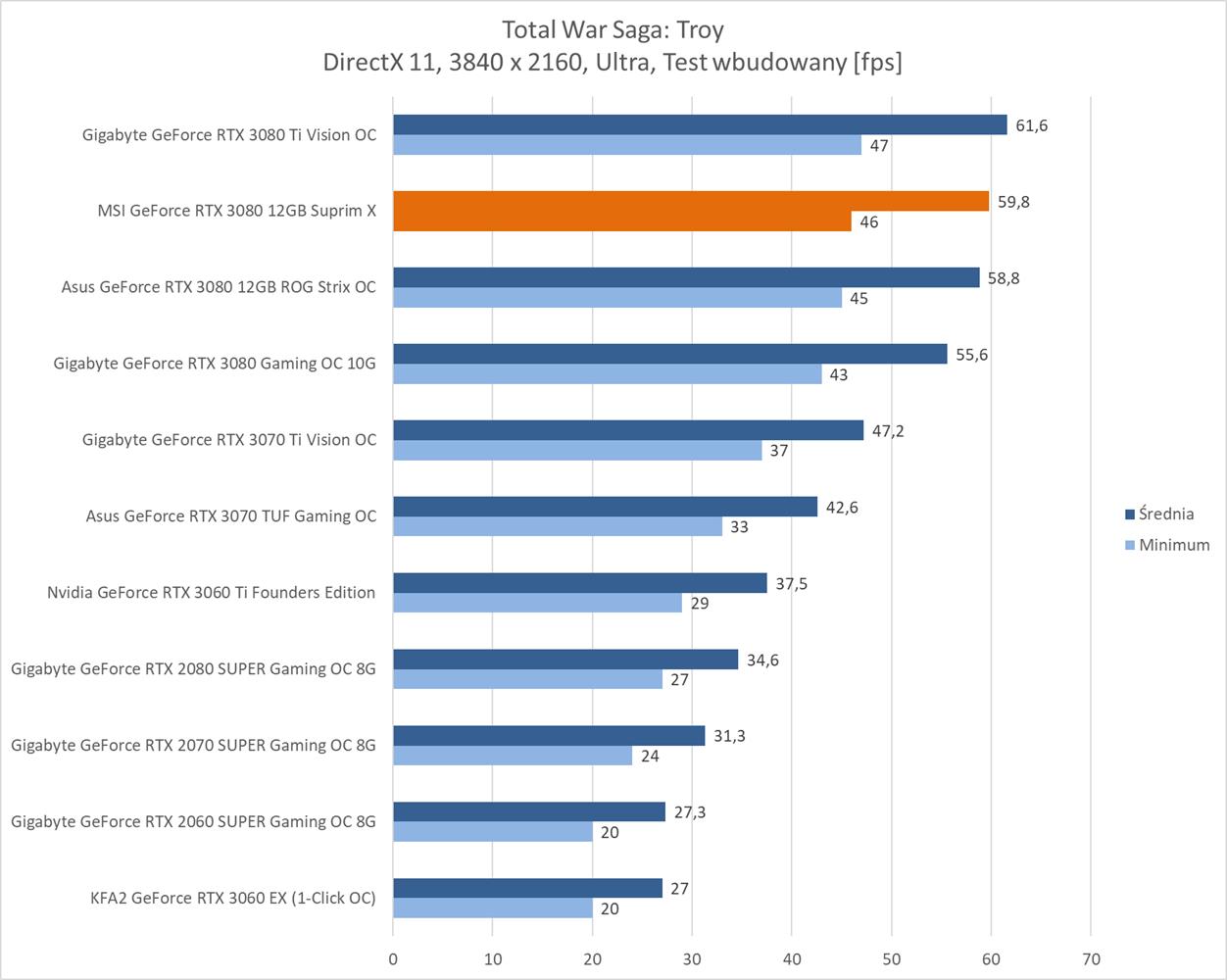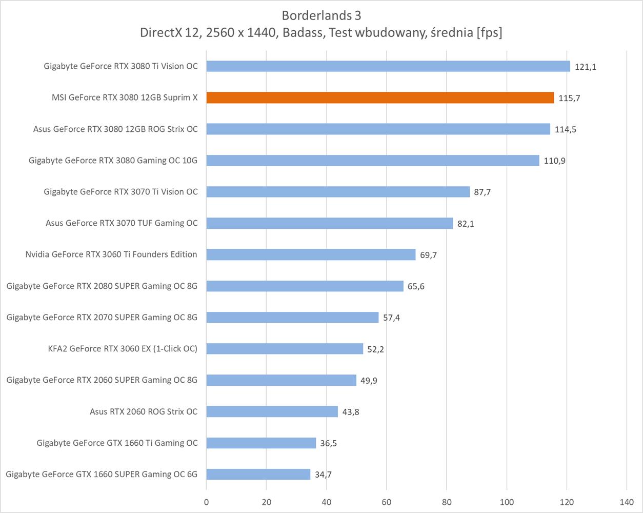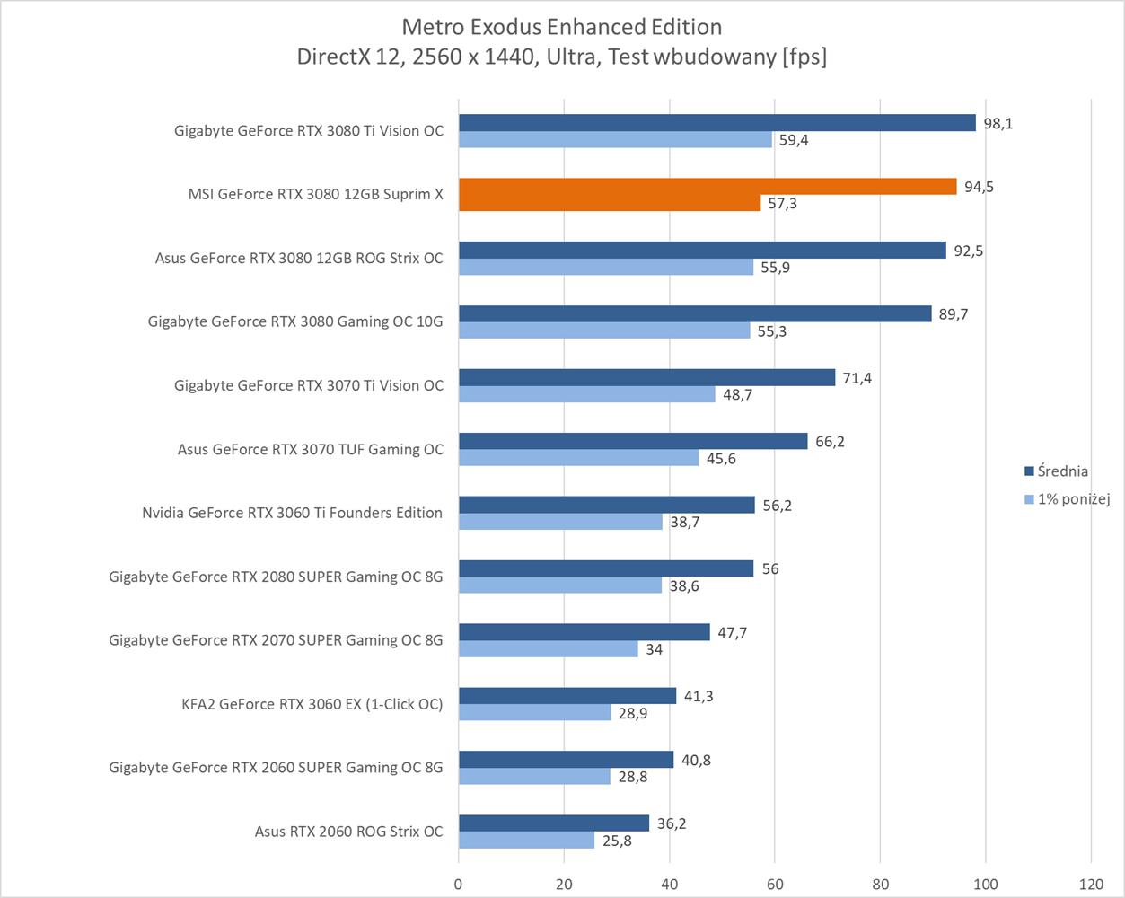 W testach w rozdzielczości 3840 x 2160 można już zauważyć spadki fps w niektórych tytułach, jednak w dalszym ciągu MSI GeForce RTX 3080 12GB Suprim X plasuje się na drugim miejscu.