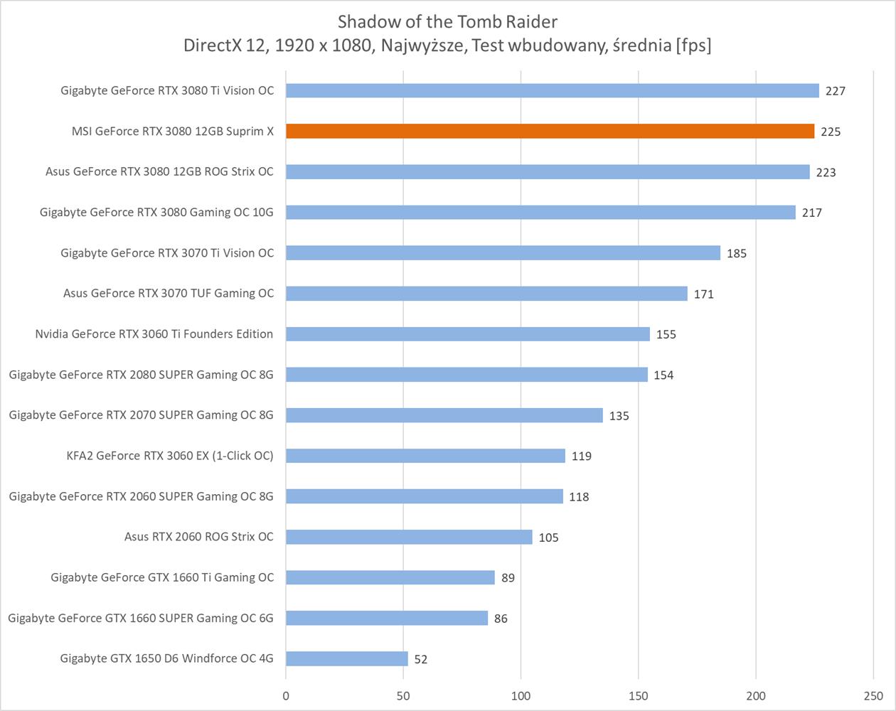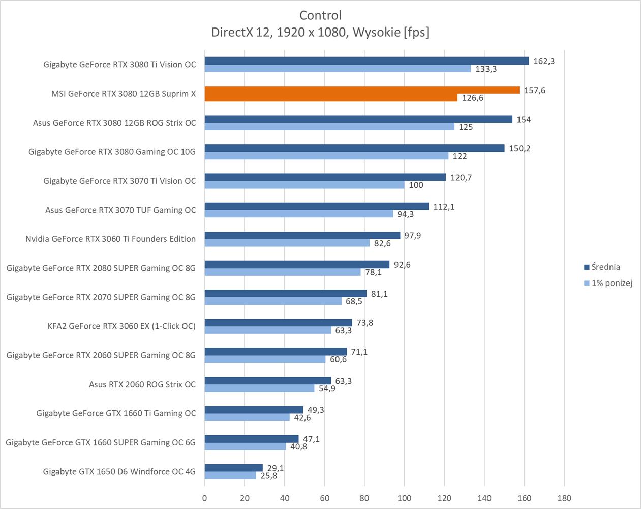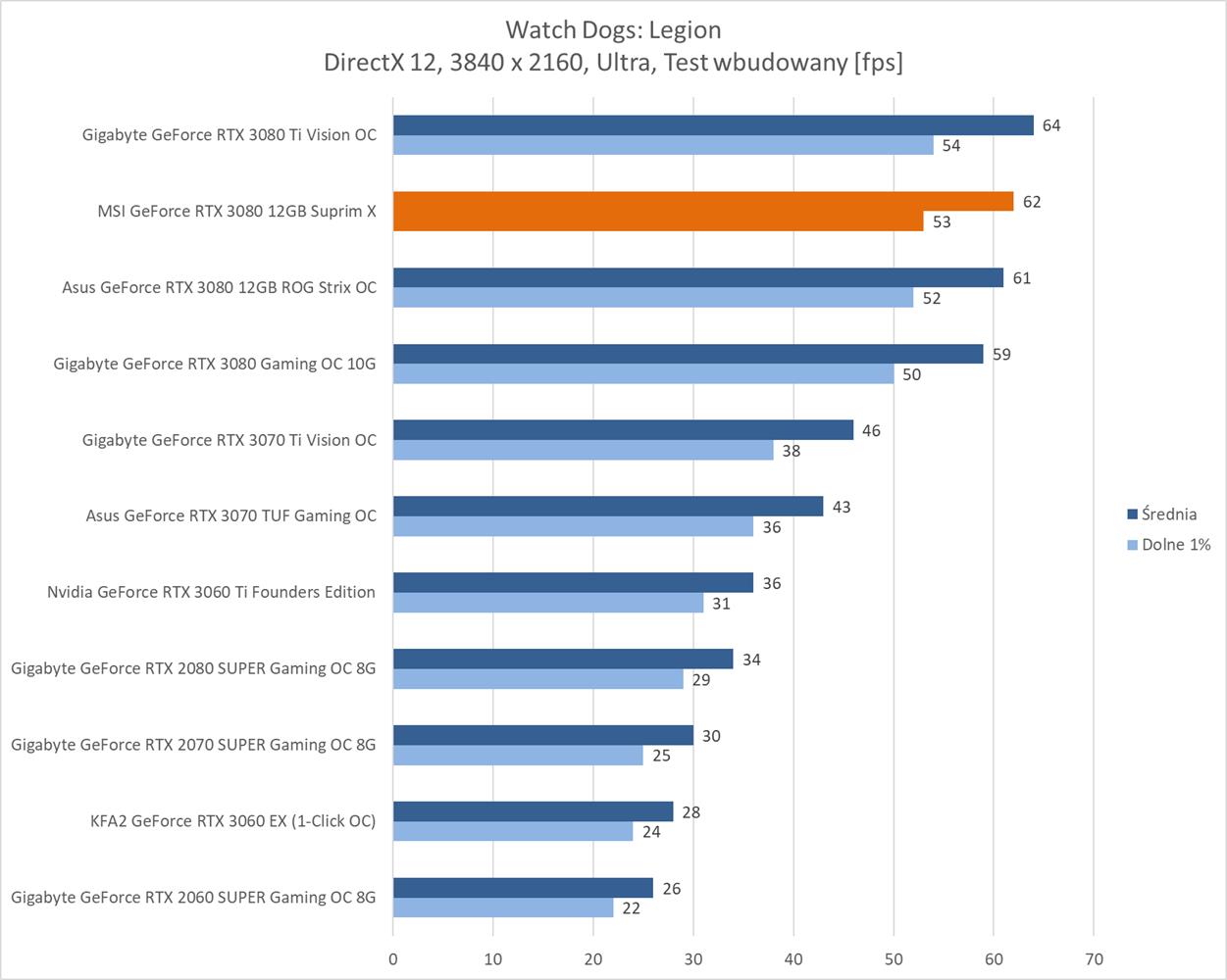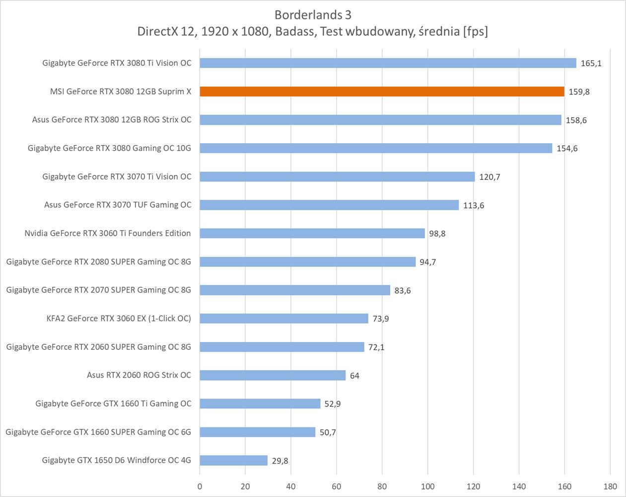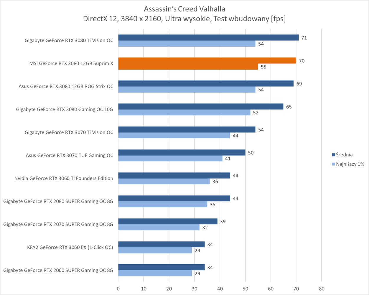 W testach w rozdzielczości 3840 x 2160 można już zauważyć spadki fps w niektórych tytułach, jednak w dalszym ciągu MSI GeForce RTX 3080 12GB Suprim X plasuje się na drugim miejscu.