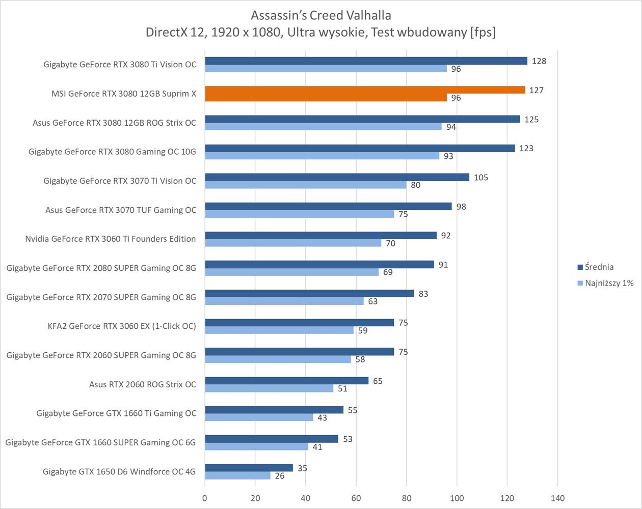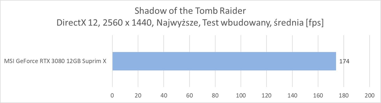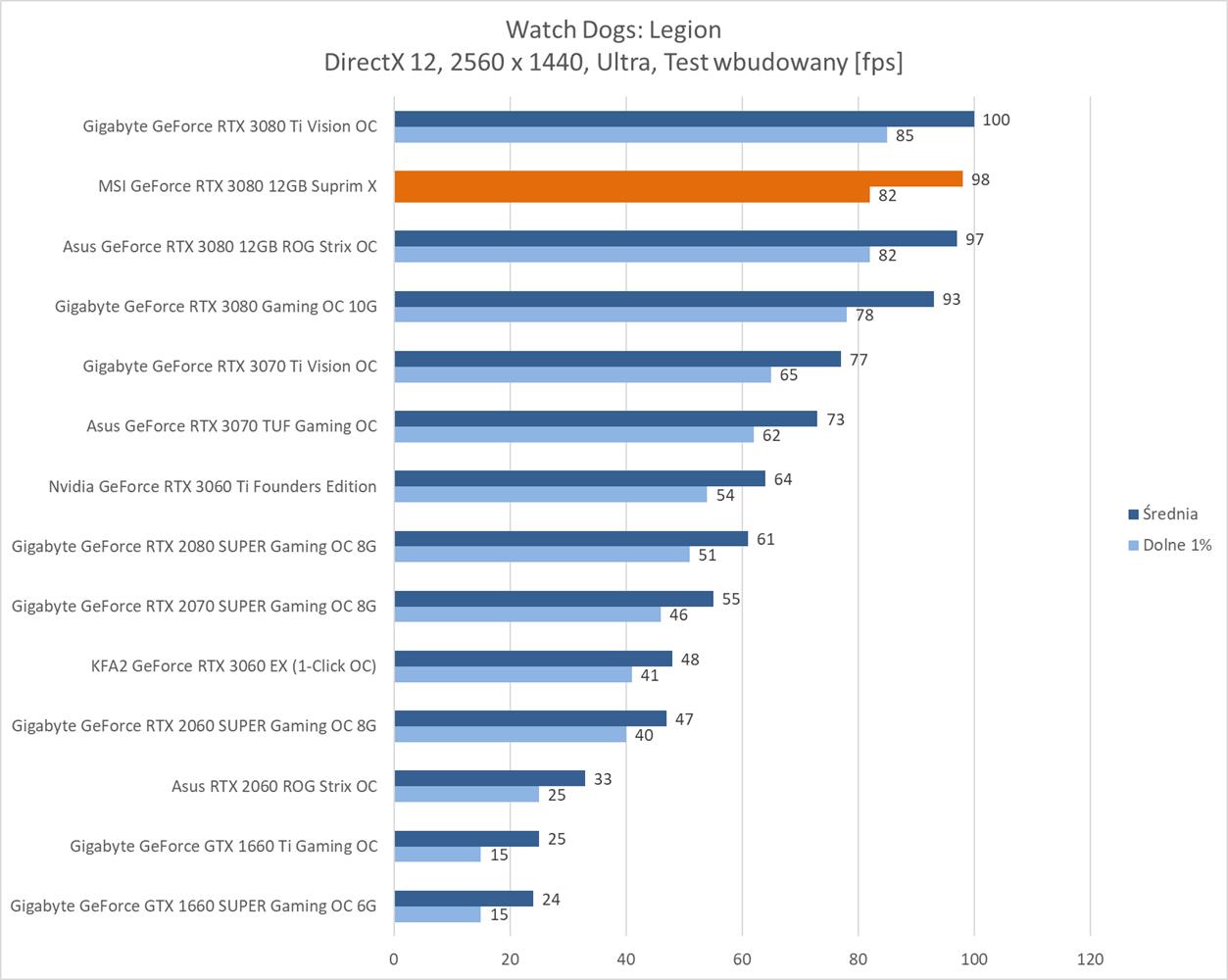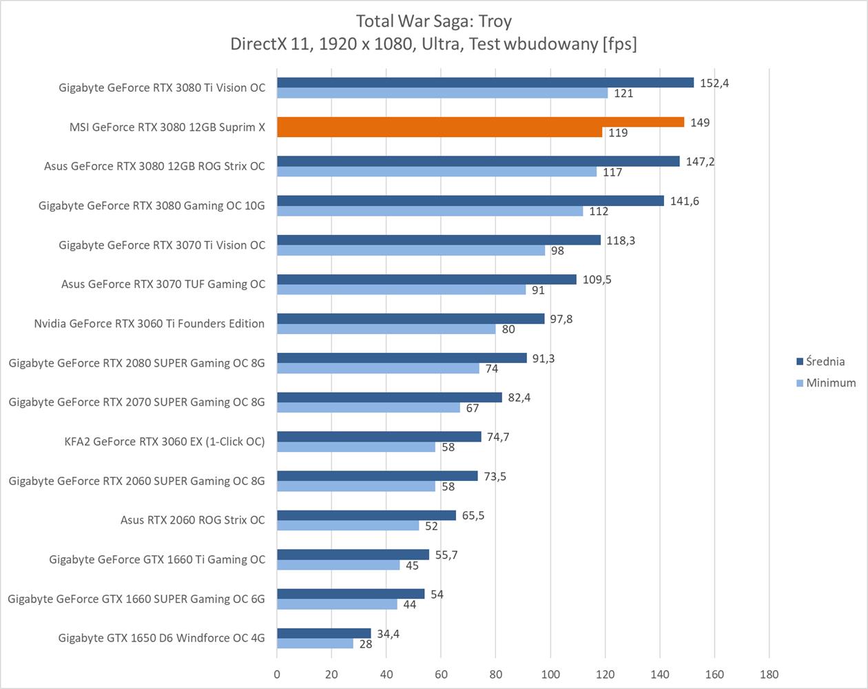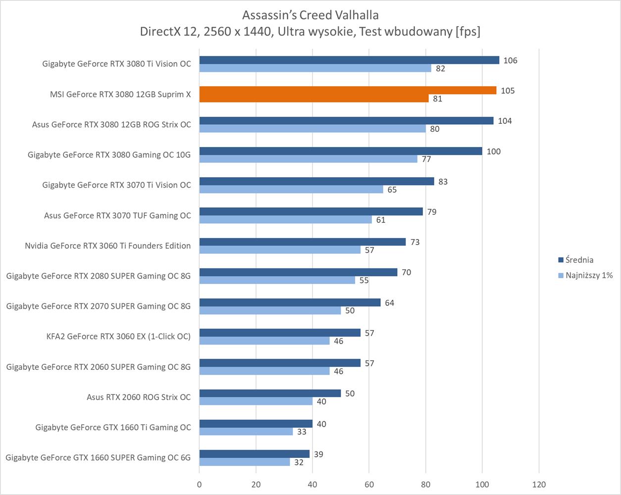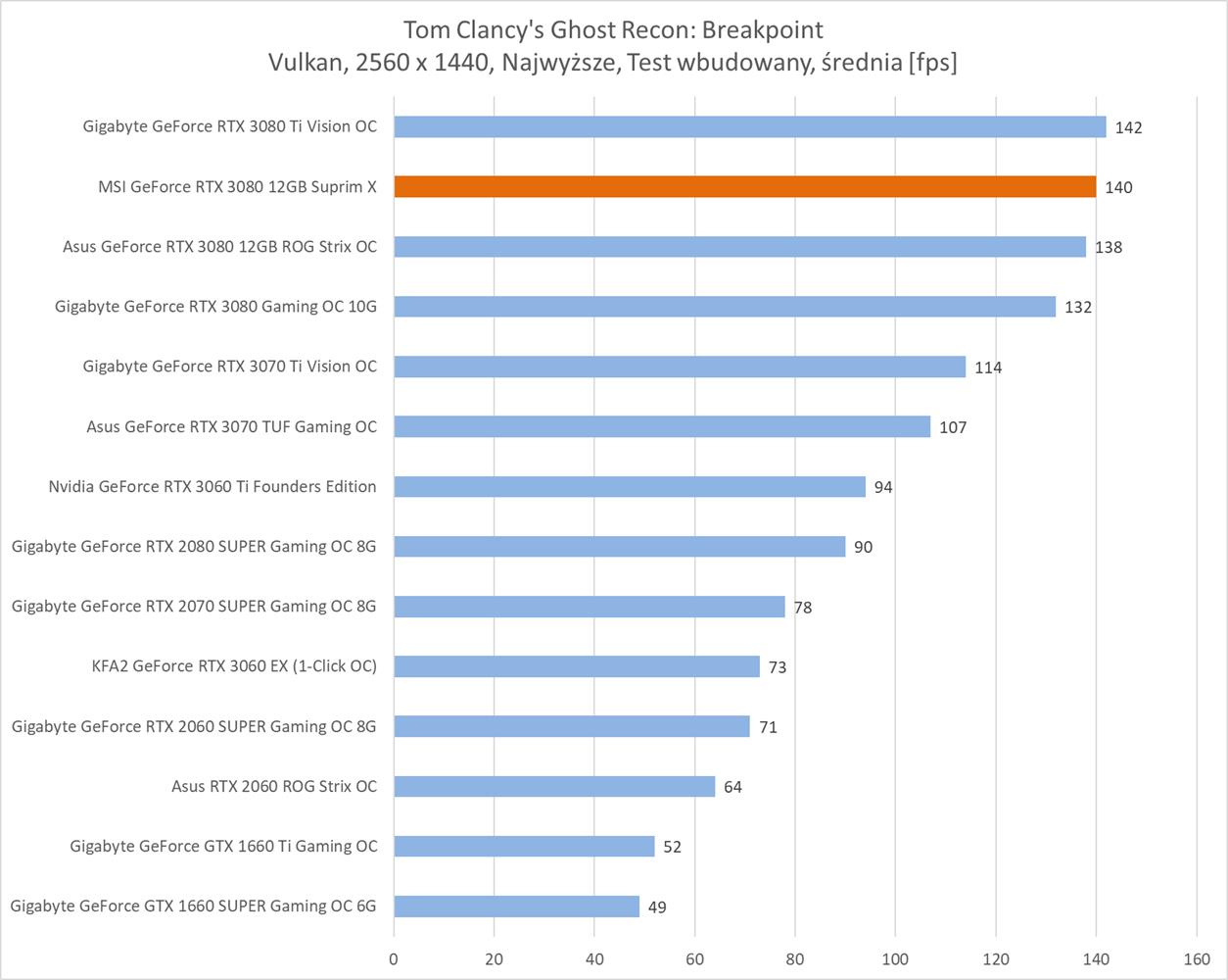 W testach w rozdzielczości 3840 x 2160 można już zauważyć spadki fps w niektórych tytułach, jednak w dalszym ciągu MSI GeForce RTX 3080 12GB Suprim X plasuje się na drugim miejscu.