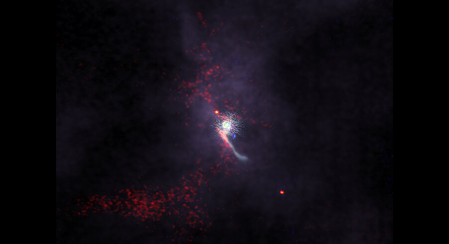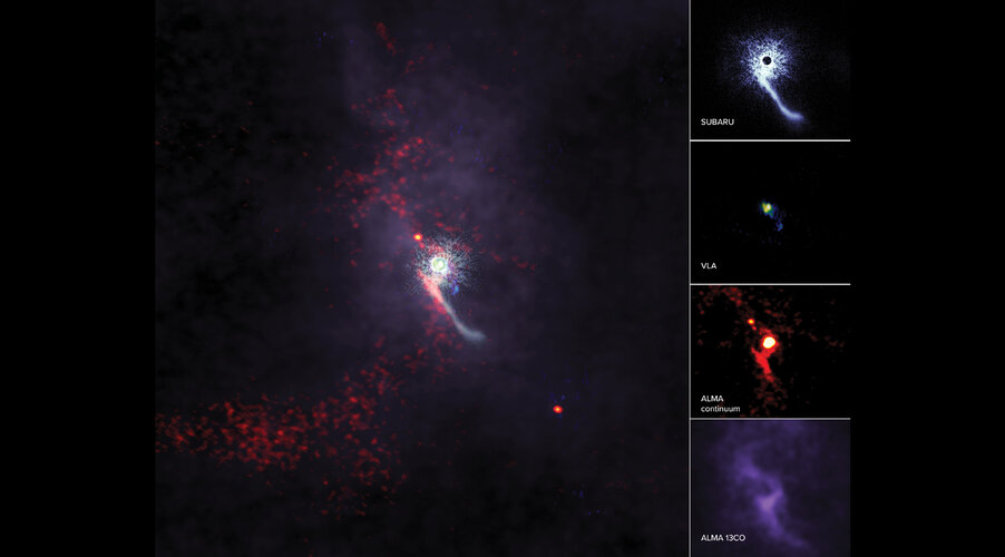 Obserwacje w podczerwieni wykazały, że w przeszłości przez jeden z tych dysków musiał przelecieć jakiś obiekt, zostawiając za sobą stosunkowo cienki strumień gazu i pyłu. Nowe obserwacje wykonane za pomocą Atacama Large Millimeter/submillimeter Array oraz Very Large Array dostarczyły nowych informacji w tej sprawie. Astronomom udało się też wykryć dwa nowe obiekty w pobliżu układu podwójnego.