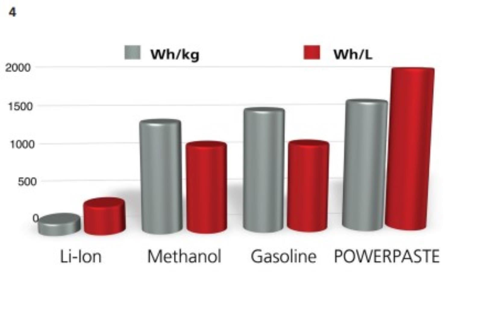 Zacznijmy więc od tego, co ma do zaoferowania Powerpaste, a ma do zaoferowania naprawdę, ale to naprawdę dużo. Najważniejsza jest gęstość energetyczna Powerpaste, która wynosi dziesięć razy więcej w porównaniu do gęstości energii w akumulatorach litowo-jonowych. Przewyższa na dodatek benzynę i dorównuje skompresowanemu wodorowi pod ciśnieniem 700 barów w zbiornikach. Wynosi bowiem całe 1600 Wh/kg i 1900 Wh/litr, a pierwotne systemy są w stanie generować moc na poziomie od 100 do 1000 watów.