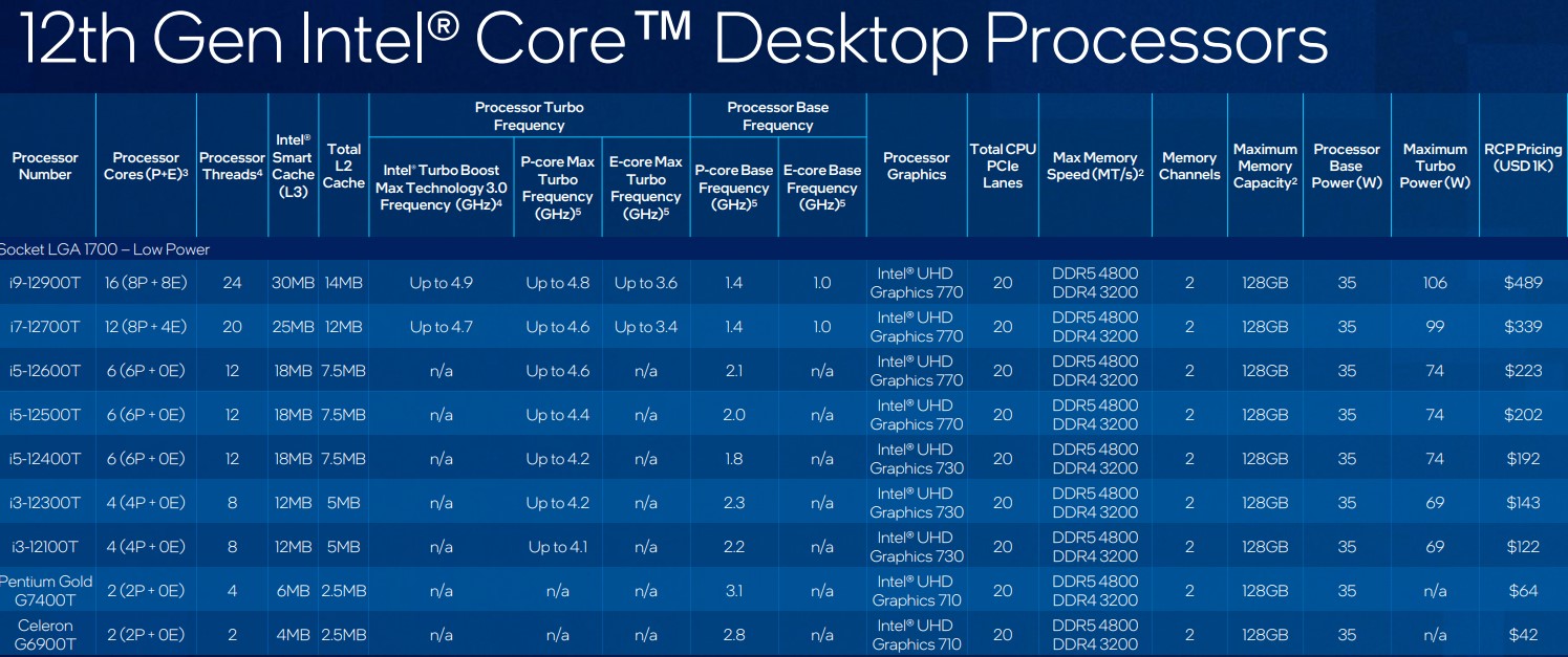 Na sam koniec warto wspomnieć o tym, że oferta obejmie całe spektrum procesorów Core 12. generacji – od najpotężniejszego przedstawiciela rodziny po stare dobre Celerony i Pentiumy. Mowa więc o odpowiednio Core i9-12900, który od i9-12900K różni się tylko zegarami i zablokowanym mnożnikiem oraz Celeronie G6900T z iGPU Intel UHD 710. Kwestie cen detalicznych zaczynają się od 42 dolarów i kończą na 489$, co wskazuje na znaczne cięcia cenowe względem modeli -K (rzędu nawet 100$), a to sugeruje cenę około 2500/2600 zł za flagową i9.