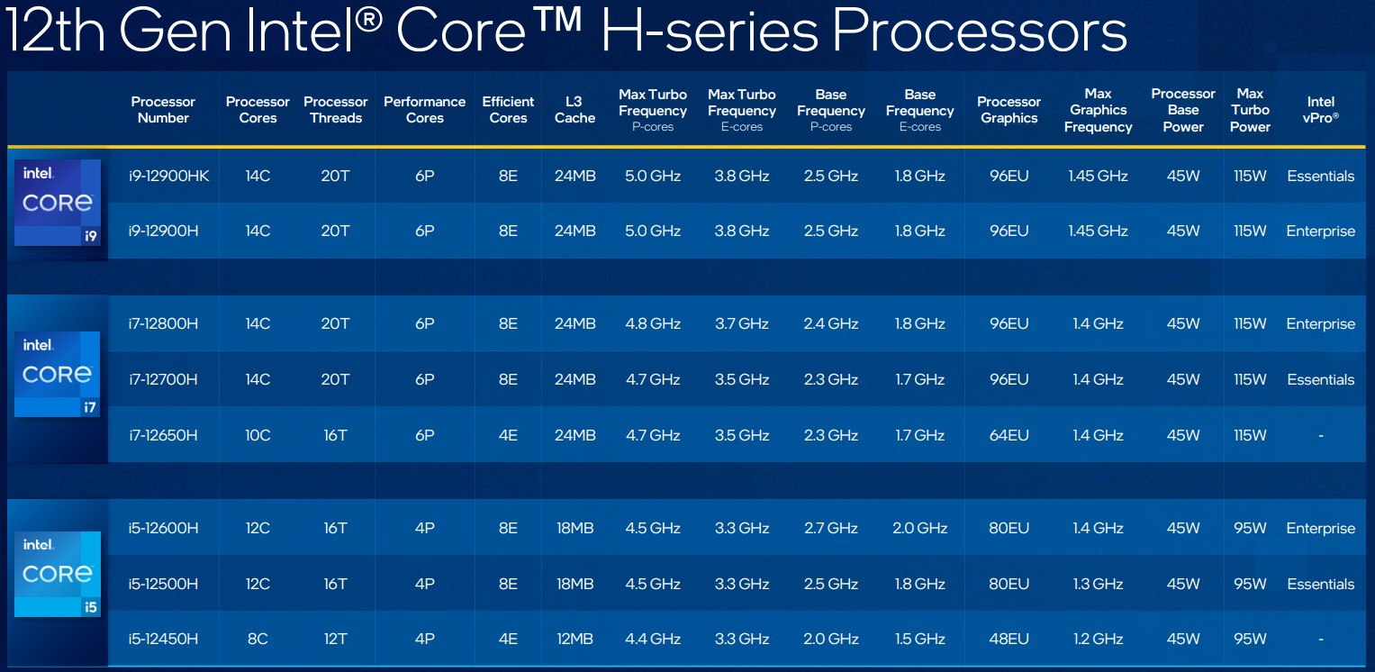 Zdecydowanie najlepiej rozpocząć przygodę od najnowszych układów, czyli tych mobilnych, które możemy podzielić na cztery główne segmenty. Najwydajniejszymi procesorami są te oznaczone literką -H (45 watów/do 115 W w MTP), tuż za nimi oznaczone -P (28 W/64 W w MTP), a finalnie te z dopiskiem -U (15- i 9-watowe), których poziom Max Turbo Power wynosi kolejno 55 i 29 watów.