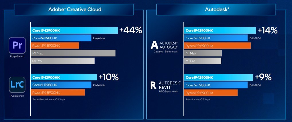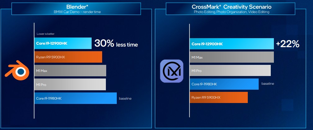 Procesory mobilne Intela mają też gwarantować niezrównaną wydajność zarówno w środowiskach profesjonalnych, jak i zastosowaniach rozrywkowych. Przykładem na wykresach są możliwości, które oferuje flagowy Core i9-12900HK z 14 rdzeniami, 20 wątkami i taktowaniem Max Turbo Frequency na poziomie 5 GHz.