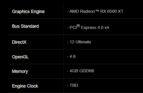 Radeon RX 6500 XT ma bazować na GPU Navi 24 XT z 1024 rdzeniami FP32 i 16 akceleratorami z myślą o ray-tracingu i wymagać do działania dodatkowego zasilania przez TBP (Total Board Power) na poziomie 107 watów.