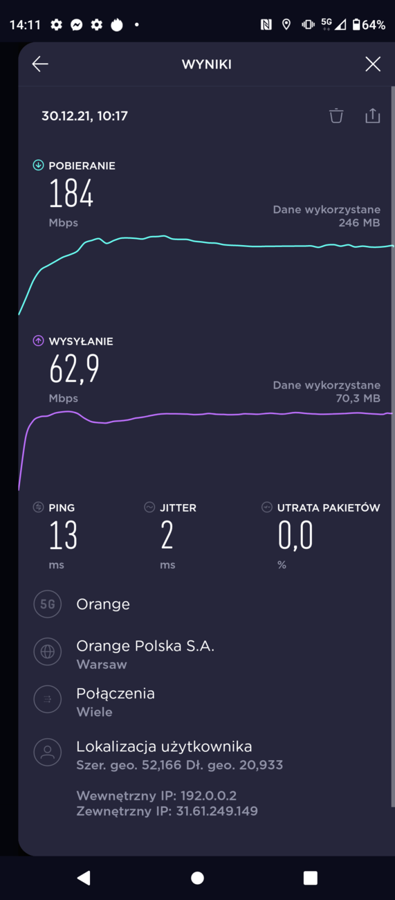 A więc tak – telefon jest pełnym Dual SIMem i jak sama nazwa wskazuje, obsługuje sieci 5G. Osiągane wyniki w sieci Orange w Warszawie były więcej niż zadowalające – 184 Mb/s w przypadku pobierania danych oraz 62,9 Mb/s w przypadku ich wysyłania. Poza tym możemy oczywiście skorzystać z Wi-Fi 6e lub LTE.
