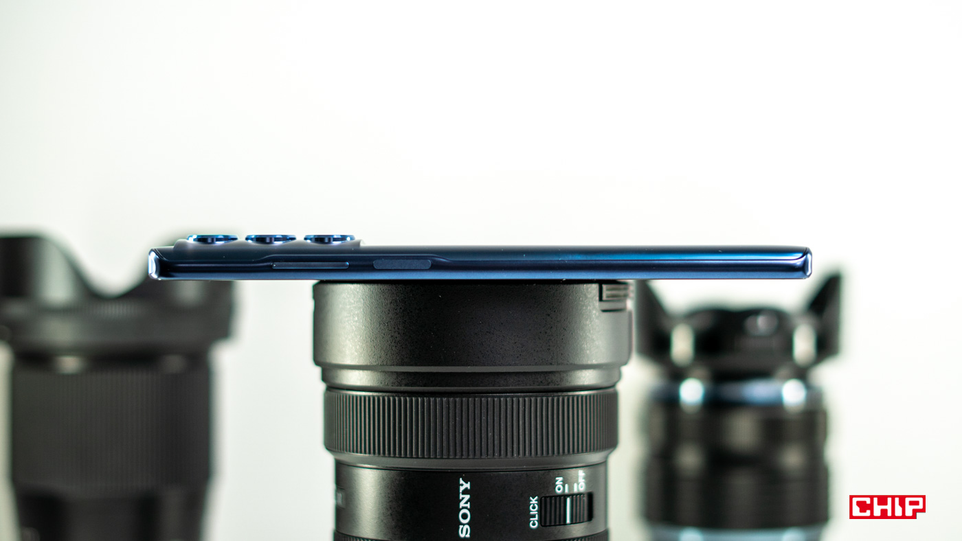 Motorola moto g200 5G nie należy ani do najcieńszych, ani do najlżejszych smartfonów. I to czuć w dłoni (202 gram). Nie jest też wykonany z jakiś szlachetnych tworzyw – jedynie plastik i płaska tafla szkła na froncie. Nie zmienia to faktu, że materiały są dobrze spasowane, a całość dobrze leży w dłoni. Niestety, mimo satynowego wykończenia tylnej części obudowy, odciski palców są na niej wyraźnie zauważalne. Na wodoszczelność obudowy też liczyć nie możemy… Obiektywy aparatów wyraźnie odstają z obrysu obudowy, co akurat jest dość ciekawie stylistycznie rozwiązane. Zobaczcie sami: