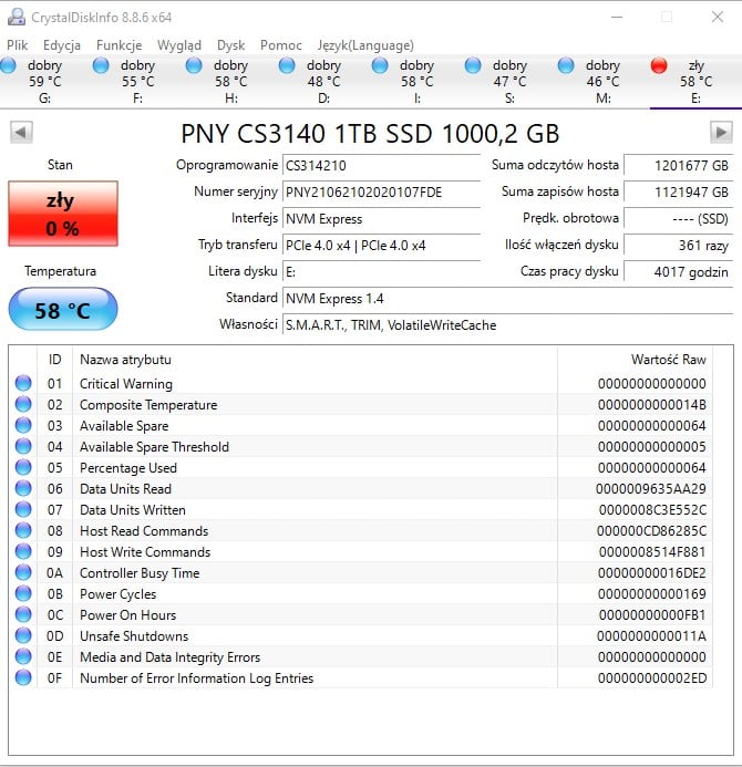 Przez to, po ponad 4000 godzinach pracy, nasz egzemplarz PNY CS3140 o pojemności 1 TB doczekał się przerażającej oceny w Crystal Disk Info. Okraszone czerwienią “Zły. 0%” podsumowanie jego stanu zauważyliśmy dopiero wtedy, kiedy zwykle wykonywane na nim prace zaczęły trwać dłużej niż powinny. Uznaliśmy to więc za świetną okazję, żeby zaprezentować Wam to, jak wypada wydajność zużytego SSD.