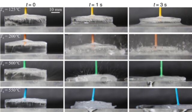 W przeciwieństwie do wody, która potrzebowała “zaledwie” 150 stopni Celsjusza do zapoczątkowania zjawiska Leidenfrosta, lód okazał się nieco bardziej wymagający. Ten sam efekt uzyskano dopiero przy 550 stopniach Celsjusza. Przy niższych temperaturach woda znajdująca się pod lodem wrzała na skutek bezpośredniego kontaktu z powierzchnią.