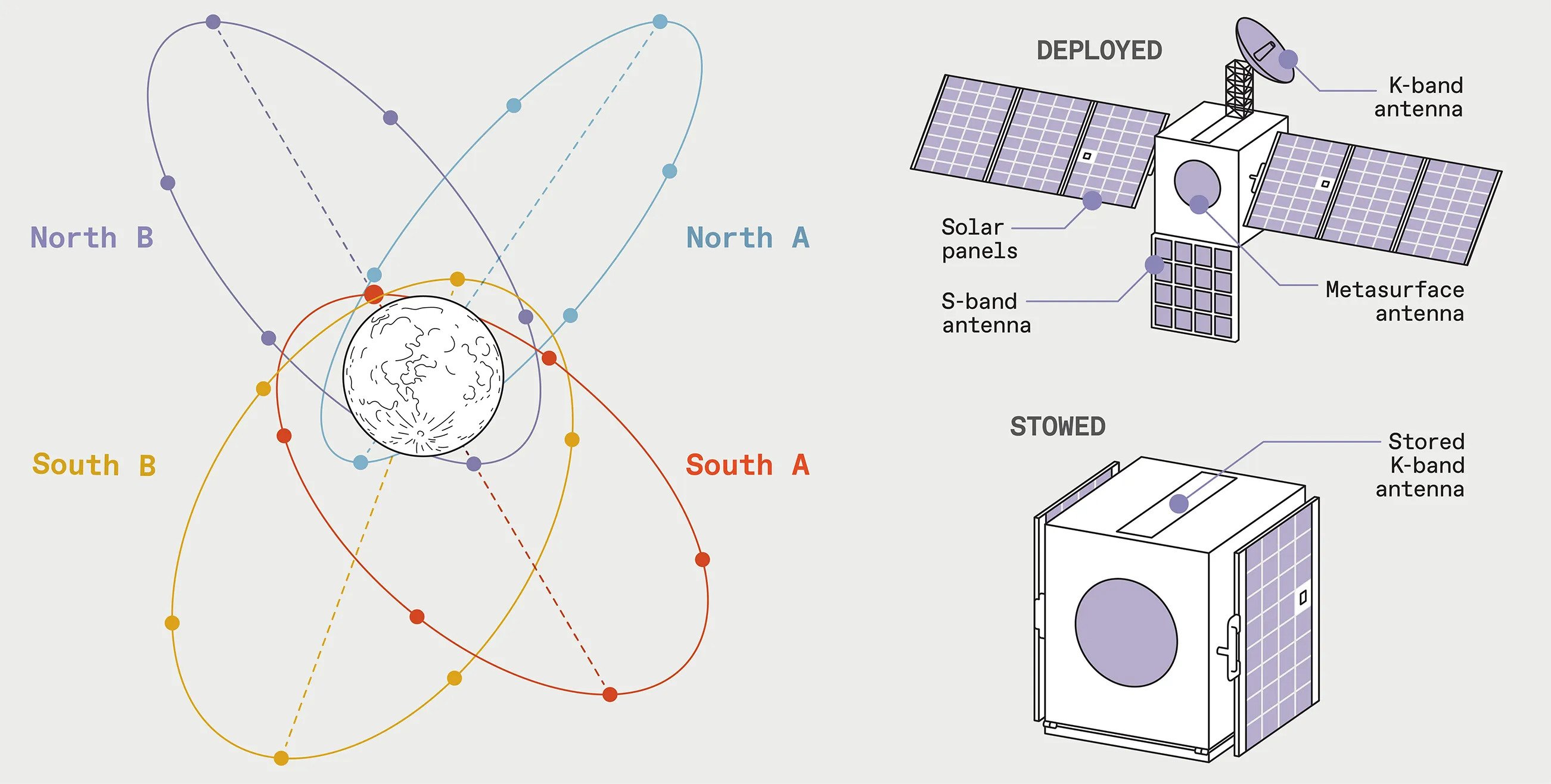 Jeśli chodzi o orbity, po których miałyby się poruszać te urządzenia, to plan zakłada, iż miałyby one być eliptyczne. Okres orbitalny miałby natomiast wynosić 12 godzin, nachylenie 57 stopni, a odległość od powierzchni Księżyca – od 720 do 8090 kilometrów. Bieguny Srebrnego Globu miałyby być pokryte z wykorzystaniem trzech satelitów przez 94 procent czasu (oraz z co najmniej jednym przez cały czas). W przypadku równika mowa o przynajmniej jednym satelicie przez 89% czasu (i trzech przez 79% czasu).
