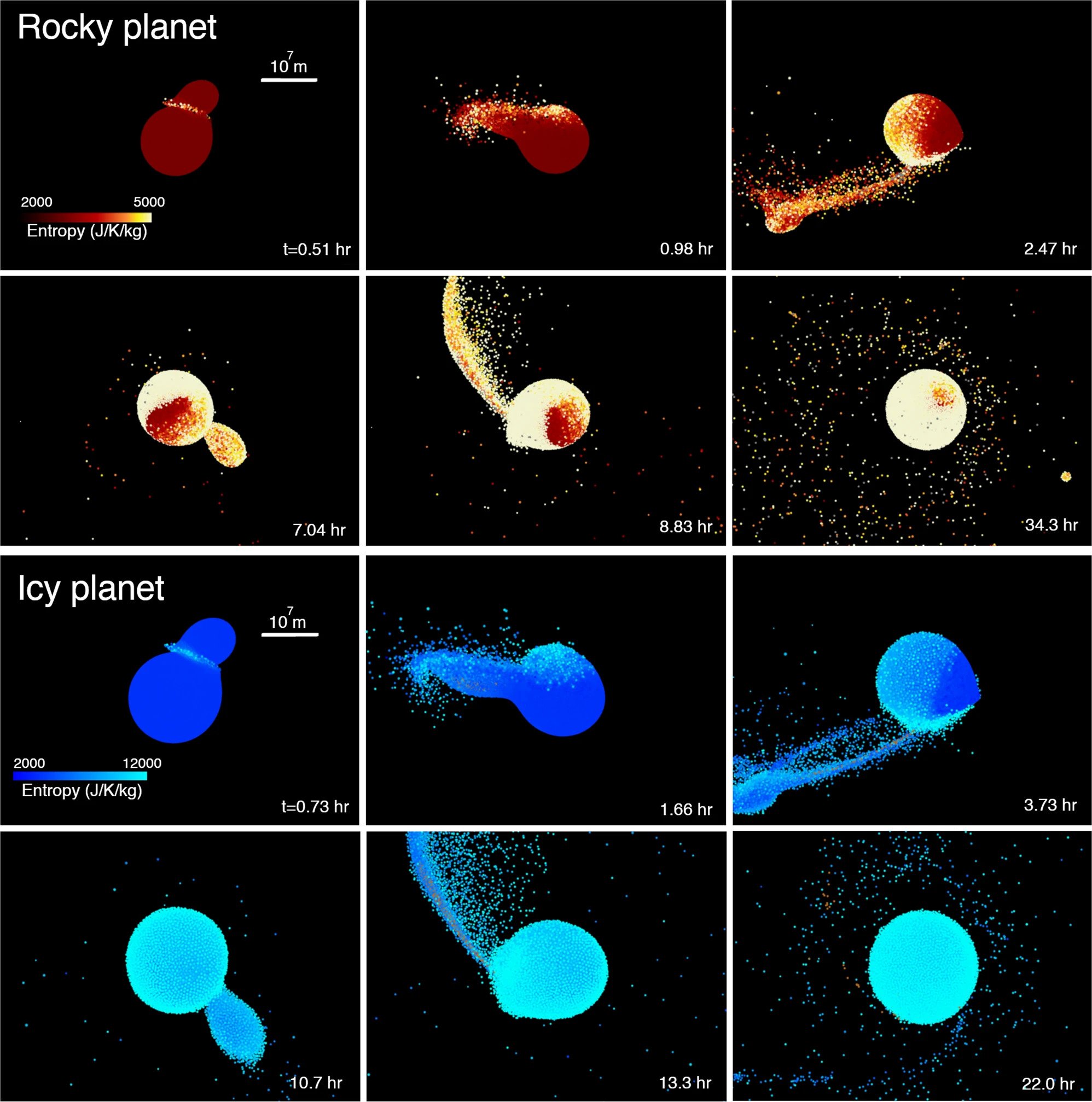 Członkowie zespołu badawczego Nakajimy przeprowadzili symulacje zderzeń, w których brały udział skaliste planety podobne do Ziemi, a także ich lodowe odpowiedniki o różnych masach. W ten sposób naukowcy zamierzali się dowiedzieć, czy w wyniku kolizji zostanie wyrzucona odpowiednio duża ilość materii, aby mógł powstać dysk, z którego następnie uformowałby się sporych rozmiarów księżyc.
