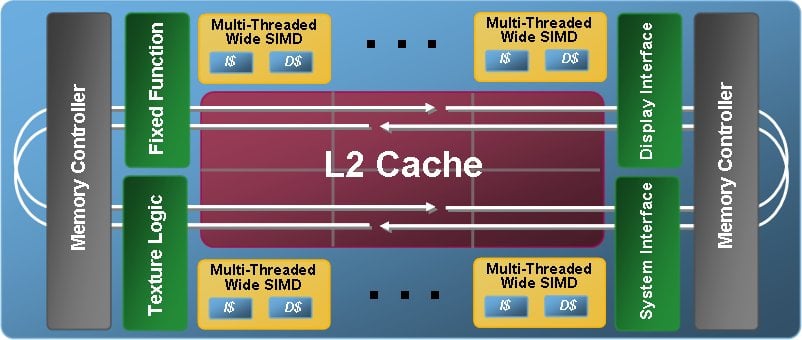 Warto tutaj wspomnieć, że procesor Larrabee wywodził się z układów Pentium, posiadając w pojedynczej matrycy do 32 rdzeni w układzie uporządkowanym z czterokierunkową wielowątkowością. Każdy rdzeń posiadał z kolei 512-bitową jednostkę przetwarzania wektorowego, a do komunikacji z pamięcią wykorzystywał dwukierunkową 512-bitową magistralę.