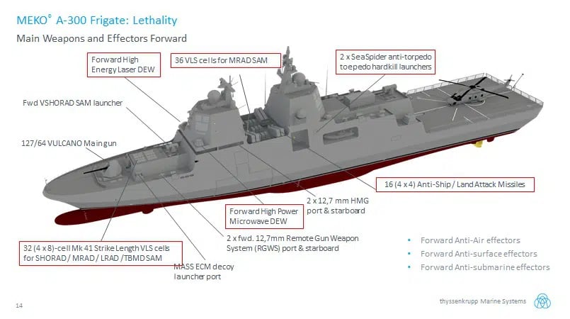 Poniżej możecie podejrzeć, jak obie fregaty wyglądają na grafikach projektowych. W ujęciu gabarytów Arrowhead-140PL, jako wersja fregat typu 31 mierzy 140 metrów długości i cechuje ją wyporność na poziomie ponad 5700 ton. Z kolei MEKO-A300, to już około 127 metrowa fregata o wyporności ~5500 ton.
